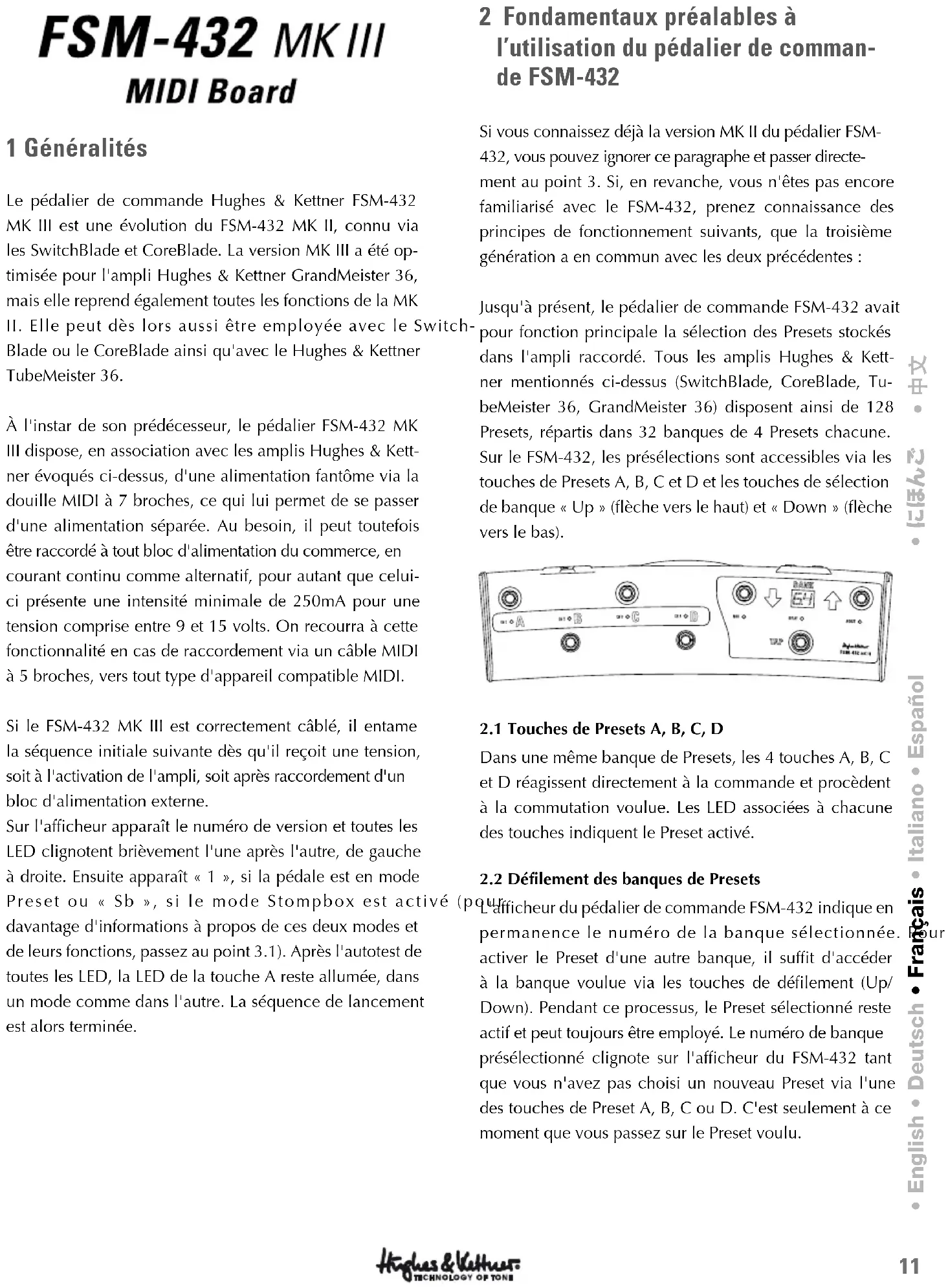 Blade ou le CoreBlade ainsi qu'avec le Hughes & Kettner TubeMeister 36. À l'instar de son prédécesseur, le pédalier FSM-432 MK III dispose, en association avec les amplis Hughes & Kett- ner évoqués ci-dessus, d'une alimentation fantôme via la douille MIDI à 7 broches, ce qui lui permet de se passer d'une alimentation séparée. Au besoin, il peut toutefois être raccordé à tout bloc d'alimentation du commerce, en courant continu comme alternatif, pour autant que celui- ci présente une intensité minimale de 250mA pour une tension comprise entre 9 et 15 volts. On recourra à cette fonctionnalité en cas de raccordement via un câble MIDI à 5 broches, vers tout type d'appareil compatible MIDI. Si le FSM-432 MK III est correctement câblé, il entame la séquence initiale suivante dès qu'il reçoit une tension, soit à l'activation de l'ampli, soit après raccordement d'un bloc d'alimentation externe. Sur l'afficheur apparaît le numéro de version et toutes les LED clignotent brièvement l'une après l'autre, de gauche à droite. Ensuite apparaît « 1 », si la pédale est en mode Preset ou « Sb », si le mode Stompbox est activé (pour davantage d'informations à propos de ces deux modes et de leurs fonctions, passez au point 3.1). Après l'autotest de toutes les LED, la LED de la touche A reste allumée, dans un mode comme dans l'autre. La séquence de lancement est alors terminée. 2 Fondamentaux préalables à l’utilisation du pédalier de comman- de FSM-432 Si vous connaissez déjà la version MK II du pédalier FSM- 432, vous pouvez ignorer ce paragraphe et passer directe- ment au point 3. Si, en revanche, vous n'êtes pas encore familiarisé avec le FSM-432, prenez connaissance des principes de fonctionnement suivants, que la troisième génération a en commun avec les deux précédentes : Jusqu'à présent, le pédalier de commande FSM-432 avait pour fonction principale la sélection des Presets stockés dans l'ampli raccordé. Tous les amplis Hughes & Kett- ner mentionnés ci-dessus (SwitchBlade, CoreBlade, Tu- beMeister 36, GrandMeister 36) disposent ainsi de 128 Presets, répartis dans 32 banques de 4 Presets chacune. Sur le FSM-432, les présélections sont accessibles via les touches de Presets A, B, C et D et les touches de sélection de banque « Up » (flèche vers le haut) et « Down » (flèche vers le bas).