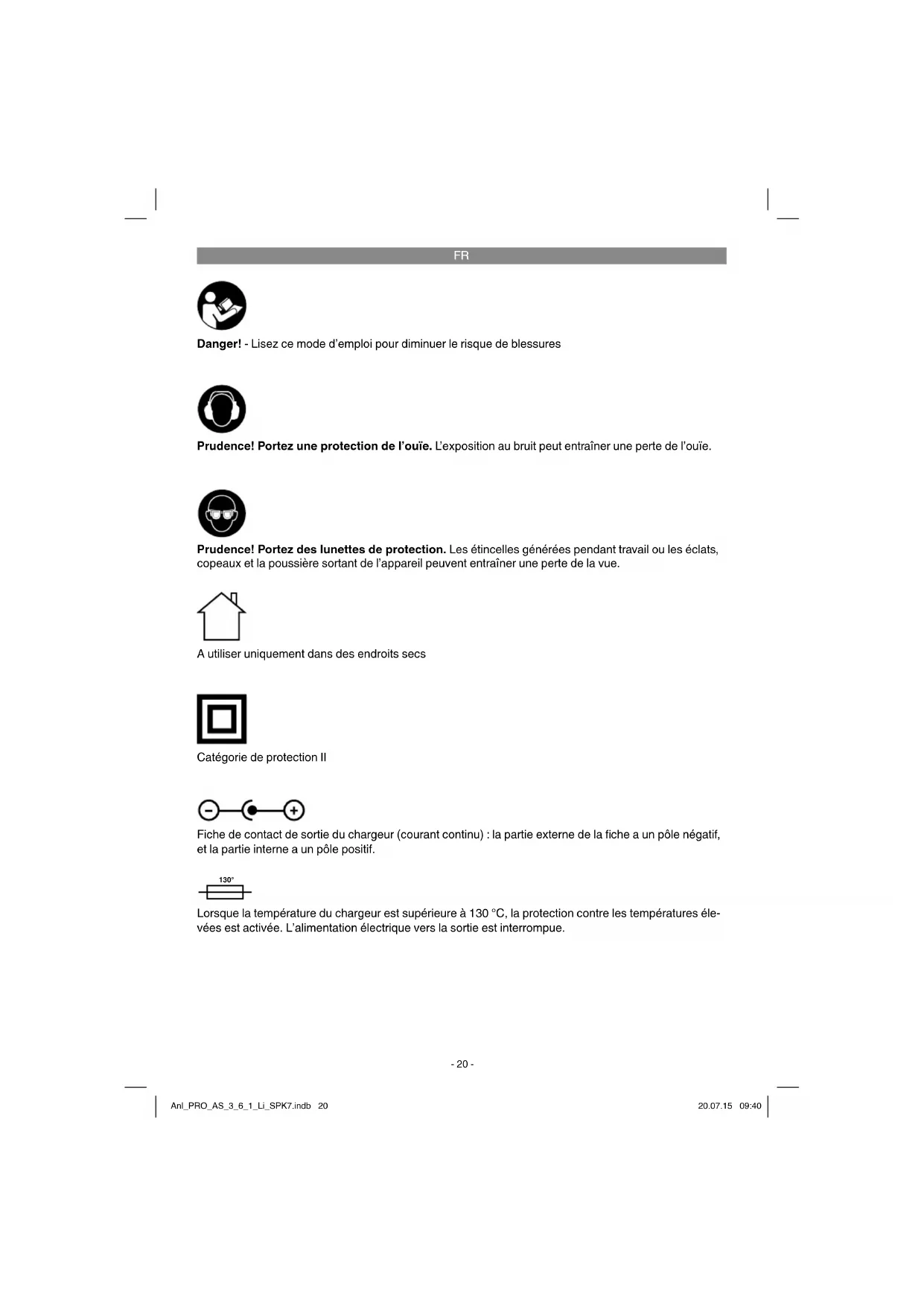 Danger! - Lisez ce mode d’emploi pour diminuer le risque de blessures Prudence! Portez une protection de l’ouïe. L’exposition au bruit peut entraîner une perte de l’ouïe. Prudence! Portez des lunettes de protection. Les étincelles générées pendant travail ou les éclats, copeaux et la poussière sortant de l’appareil peuvent entraîner une perte de la vue. A utiliser uniquement dans des endroits secs Catégorie de protection II Fiche de contact de sortie du chargeur (courant continu) : la partie externe de la fi che a un pôle négatif, et la partie interne a un pôle positif. 130° Lorsque la température du chargeur est supérieure à 130 °C, la protection contre les températures éle- vées est activée. L’alimentation électrique vers la sortie est interrompue. Anl_PRO_AS_3_6_1_Li_SPK7.indb 20Anl_PRO_AS_3_6_1_Li_SPK7.indb 20 20.07.15 09:4020.07.15 09:40FR