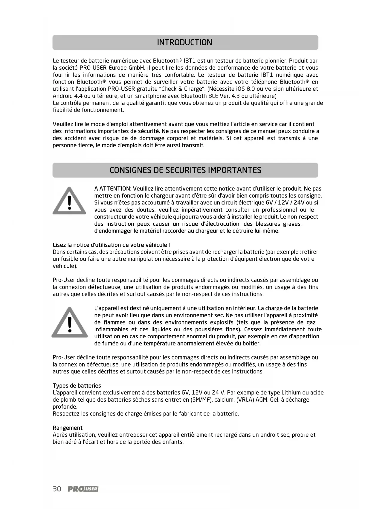 Le testeur de batterie numérique avec Bluetooth® IBT1 est un testeur de batterie pionnier. Produit par la société PRO-USER Europe GmbH, il peut lire les données de performance de votre batterie et vous fournir les informations de manière très confortable. Le testeur de batterie IBT1 numérique avec fonction Bluetooth® vous permet de surveiller votre batterie avec votre téléphone Bluetooth® en utilisant l’application PRO-USER gratuite "Check & Charge". (Nécessite iOS 8.0 ou version ultérieure et Android 4.4 ou ultérieure, et un smartphone avec Bluetooth BLE Ver. 4.3 ou ultérieure) Le contrôle permanent de la qualité garantit que vous obtenez un produit de qualité qui offre une grande fiabilité de fonctionnement. Veuillez lire le mode d'emploi attentivement avant que vous mettiez l'article en service car il contient des informations importantes de sécurité. Ne pas respecter les consignes de ce manuel peux conduire a des accident avec risque de de dommage corporel et matériels. Si cet appareil est transmis à une personne tierce, le mode d’emplois doit être aussi transmit.