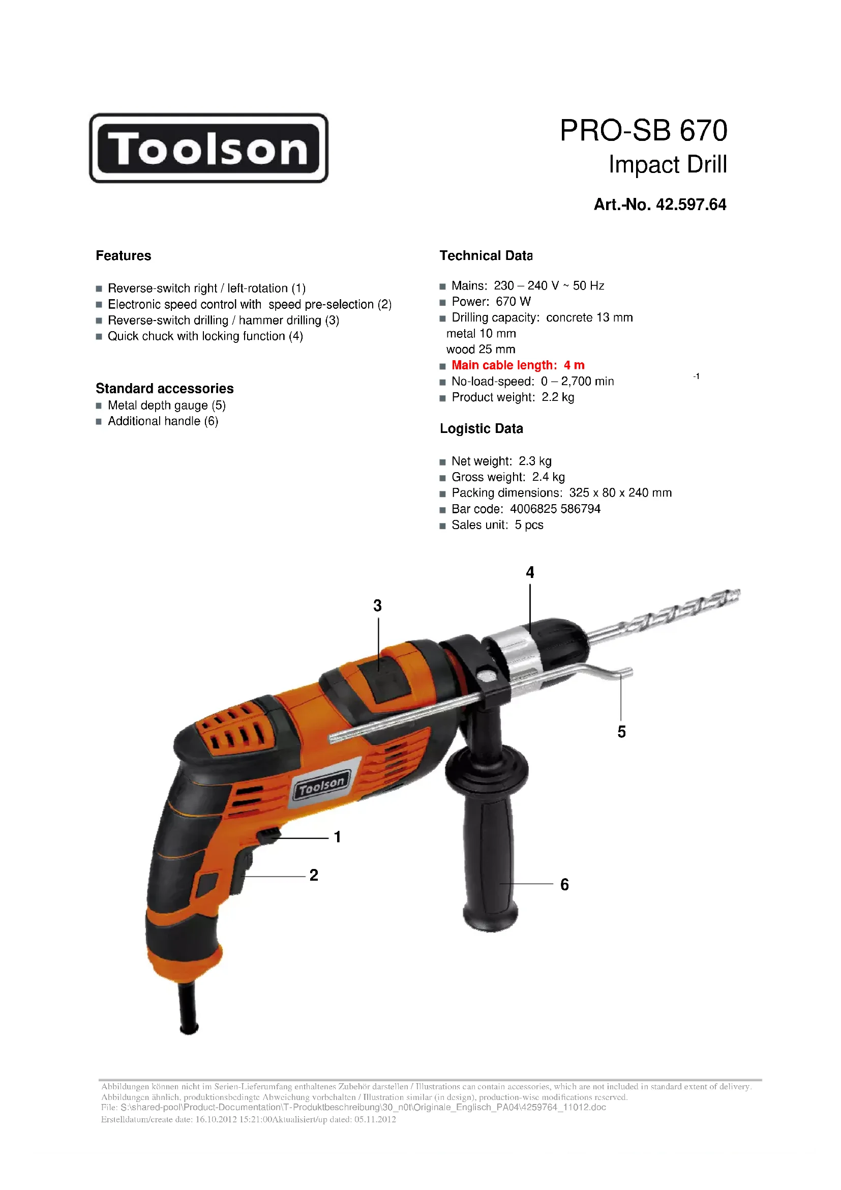 Téléchargez la notice de votre Perceuse au format PDF gratuitement ! Retrouvez votre notice PRO-SB 670 - Toolson et reprennez votre appareil électronique en main. Sur cette page sont publiés tous les documents nécessaires à l'utilisation de votre appareil PRO-SB 670 de la marque Toolson.