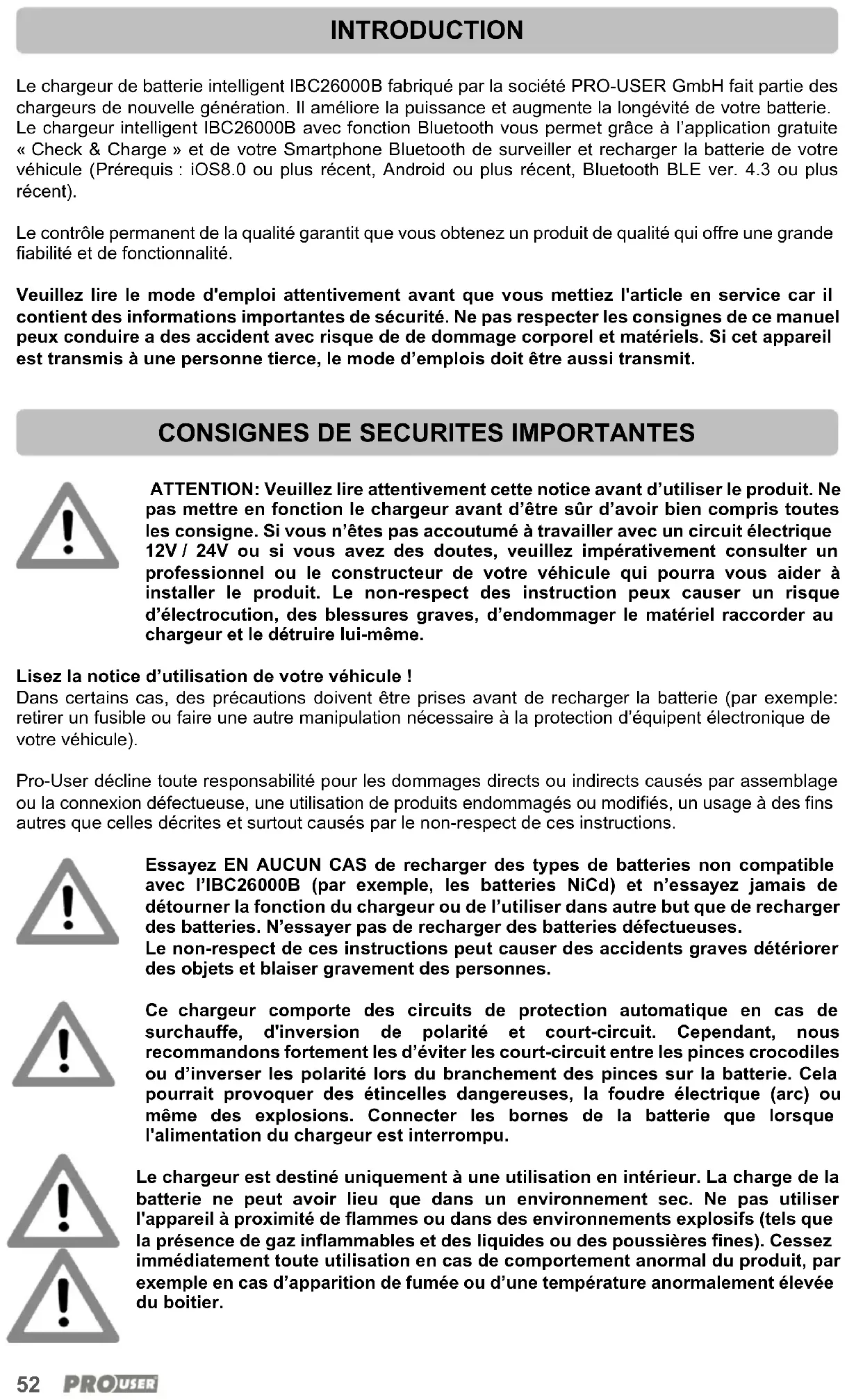 Le chargeur de batterie intelligent IBC26000B fabriqué par la société PRO-USER GmbH fait partie des chargeurs de nouvelle génération. Il améliore la puissance et augmente la longévité de votre batterie. Le chargeur intelligent IBC26000B avec fonction Bluetooth vous permet grâce à l’application gratuite « Check & Charge » et de votre Smartphone Bluetooth de surveiller et recharger la batterie de votre véhicule (Prérequis : iOS8.0 ou plus récent, Android ou plus récent, Bluetooth BLE ver. 4.3 ou plus récent). Le contrôle permanent de la qualité garantit que vous obtenez un produit de qualité qui offre une grande fiabilité et de fonctionnalité. Veuillez lire le mode d'emploi attentivement avant que vous mettiez l'article en service car il contient des informations importantes de sécurité. Ne pas respecter les consignes de ce manuel peux conduire a des accident avec risque de de dommage corporel et matériels. Si cet appareil est transmis à une personne tierce, le mode d’emplois doit être aussi transmit.