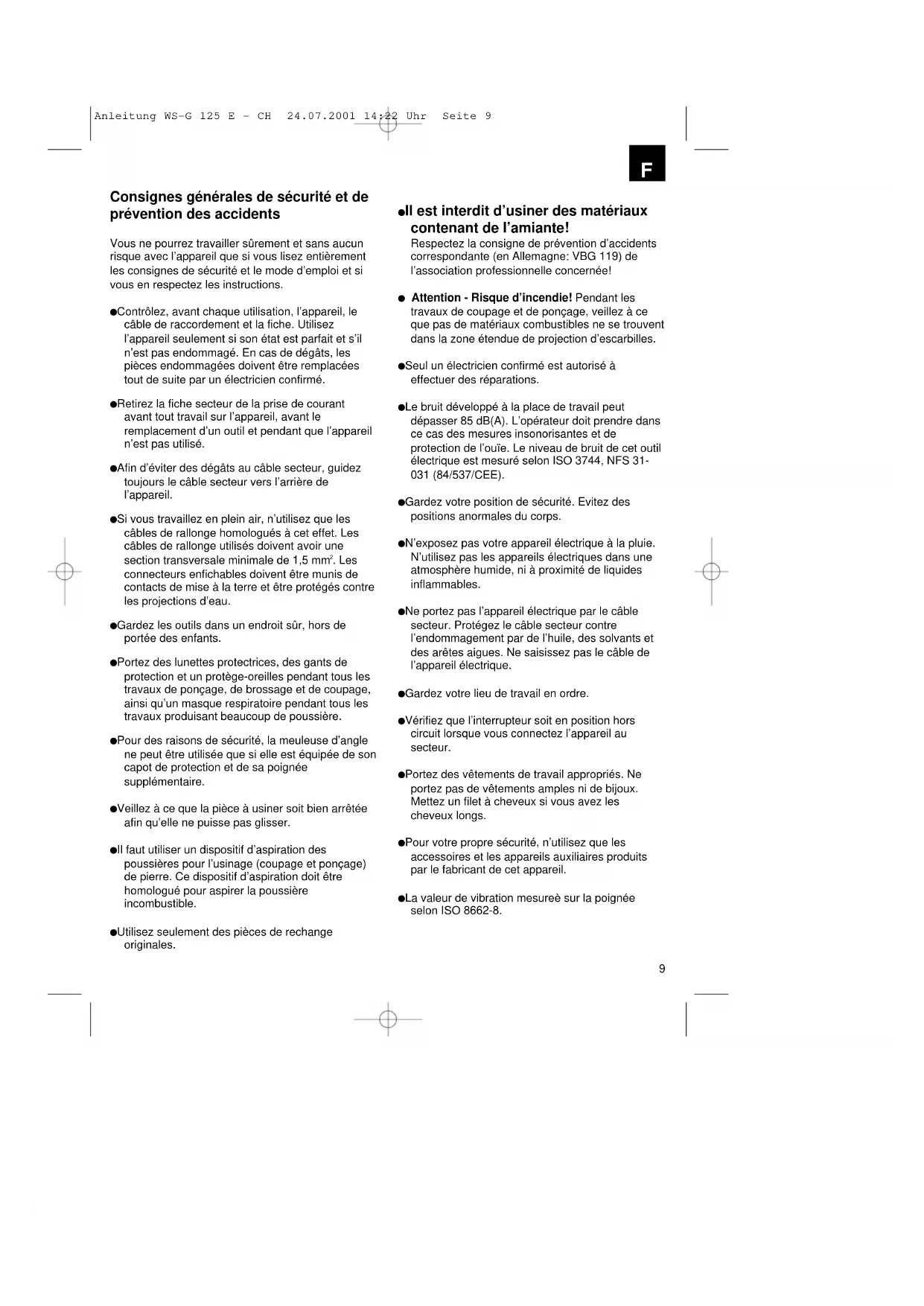 Clamping flange Flange nut Flange arrangement when using a straight cutting wheel Anleitung WS-G 125 E - CH 24.07.2001 14:22 Uhr Seite 89 Consignes générales de sécurité et de prévention des accidents Vous ne pourrez travailler sûrement et sans aucun risque avec l’appareil que si vous lisez entièrement les consignes de sécurité et le mode d’emploi et si vous en respectez les instructions. Contrôlez, avant chaque utilisation, l’appareil, le câble de raccordement et la fiche. Utilisez l’appareil seulement si son état est parfait et s’il n’est pas endommagé. En cas de dégâts, les pièces endommagées doivent être remplacées tout de suite par un électricien confirmé. Retirez la fiche secteur de la prise de courant avant tout travail sur l’appareil, avant le remplacement d’un outil et pendant que l’appareil n’est pas utilisé. Afin d’éviter des dégâts au câble secteur, guidez toujours le câble secteur vers l’arrière de l’appareil. Si vous travaillez en plein air, n’utilisez que les câbles de rallonge homologués à cet effet. Les câbles de rallonge utilisés doivent avoir une section transversale minimale de 1,5 mm