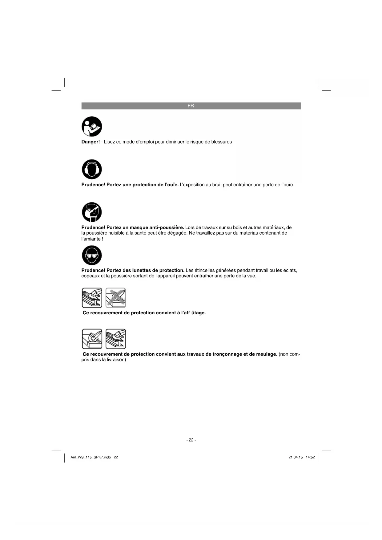 Danger! - Lisez ce mode d’emploi pour diminuer le risque de blessures Prudence! Portez une protection de l’ouïe. L’exposition au bruit peut entraîner une perte de l’ouïe. Prudence! Portez des lunettes de protection. Les étincelles générées pendant travail ou les éclats, copeaux et la poussière sortant de l’appareil peuvent entraîner une perte de la vue. Prudence! Portez un masque anti-poussière. Lors de travaux sur su bois et autres matériaux, de la poussière nuisible à la santé peut être dégagée. Ne travaillez pas sur du matériau contenant de l’amiante ! Ce recouvrement de protection convient aux travaux de tronçonnage et de meulage. (non com- pris dans la livraison) Ce recouvrement de protection convient à l’aff ûtage. Anl_WS_115_SPK7.indb 22Anl_WS_115_SPK7.indb 22 21.04.15 14:5221.04.15 14:52FR