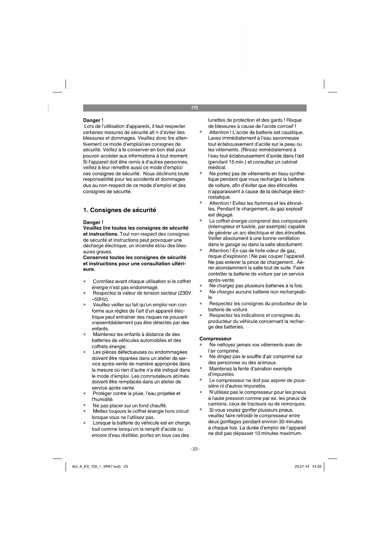 Si vous voulez gonfler plusieurs pneus, veuillez faire refroidir le compresseur entre deux gonflages pendant environ 30 minutes à chaque fois. La durée d’emploi de l’appareil ne doit pas dépasser 10 minutes maximum. Anl_A_ES_700_1_SPK7.indb 23Anl_A_ES_700_1_SPK7.indb 23 23.07.14 14:2223.07.14 14:22FR