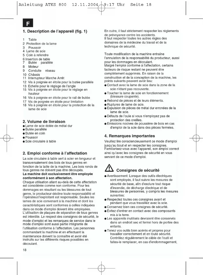 N’utilisez le tambour de câble qu’en état déroulé. Ne portez pas la scie par son câble. Vérifiez la conduite de raccordement au réseau. N’utilisez aucune conduite de raccordement erronée ou endommagée. N’utilisez pas le câble pour tirer le connecteur de la prise. Protégez le câble de la chaleur, contre tout contact avec de l’huile et des arêtes acérées. N’exposez pas la scie à la pluie et n’utilisez pas la machine dans un environnement humide ou mouillé. Veillez à un bon éclairage. Lors de travaux en plein air, il est recommandé de porter des chaussures antidérapantes. Ne sciez pas à proximité de fluides ou de gaz combustibles. Portez la tenue de travail appropriée ! Des habits ou des bijoux larges peuvent être entraînés par la lame de scie en rotation. Il est recommandable de porter des chaussures anti-dérapantes pour les travaux à l’extérieur. Portez un filet à cheveux pour les cheveux longs. Evitez une tenue anormale du corps. La personne opératrice doit avoir au moins 18 ans, les stagiaires au moins 16 ans, cependant uniquement sous surveillance. Le désordre du lieu de travail peut entraîner des accidents. Ne laissez pas d’autres personnes toucher l’outil ou le câble, ceci est en particulier valable pour les enfants. Tenez-les à l’écart de votre poste de travail. Tenez les enfants à l’écart des appareils raccordés au réseau. Maintenez votre lieu de travail sans déchets de bois et pièces éparpillées. Il ne faut pas détourner l’attention de personnes travaillant sur la machine. Respectez le sens de rotation du moteur et de la scie. Les lames de scie (4) ne doivent en aucun cas être freinées après la mise hors circuit de l’entraînement en effectuant une pression contre elles. Ne montez que des lames de scie (4) aiguisées, sans fissures et n’étant pas déformées. N’employez aucune lame de scie circulaire (4) en acier à coupe très rapide fortement allié (HSS). Les dispositifs de sécurité (2, 5) de la machine ne doivent pas être démontés ni rendus inutilisables. Utilisez uniquement les lames recommandées par le producteur, conformes à EN 847-1, avec un avertissement : lors du remplacement de la lame de scie, veillez à ce que la largeur de coupe ne soit pas plus petite et à ce que l’épaisseur du tronc de la lame de scie ne soit pas plus grande que celle du coin à refendre. Les lames de scie erronées (4) doivent être remplacées sans délai. N’utilisez pas de lames de scie ne correspondant pas aux caractéristiques indiquées dans ce mode d’emploi. Il faut s’assurer que tous les dispositifs (2, 15) qui recouvrent la lame de scie fonctionnent bien parfaitement. Remplacez les plaques d’insertions usées. Attention: Les découpes d’inserts ne doivent pas être effectuées avec cette scie. Les dispositifs de protection endommagés ou erronés doivent être échangés sans délai. Le coin à refendre (5) est un dispositif de protection important qui permet de guider la pièce à usiner et de fermer la fente de coupe derrière la lame de scie, ce qui empêche que la pièce à usiner ne rebondisse. Veillez à ce que l’épaisseur du coin à refendre soit correcte. Le Anleitung ATKS 800 12.11.2004 9:17 Uhr Seite 19F