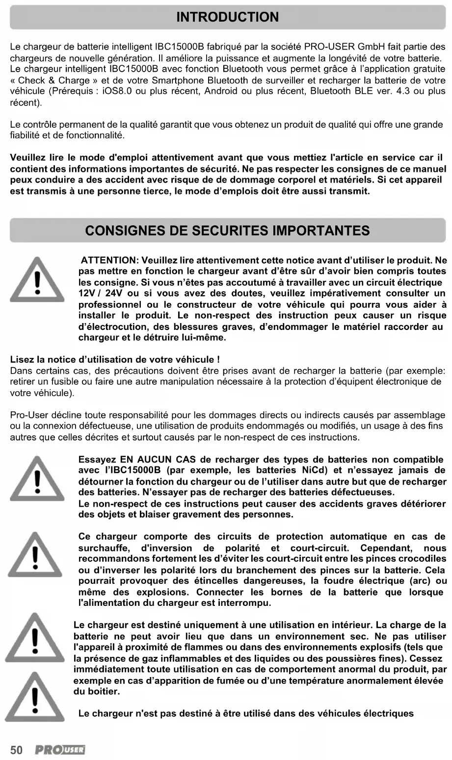 Le chargeur de batterie intelligent IBC15000B fabriqué par la société PRO-USER GmbH fait partie des chargeurs de nouvelle génération. Il améliore la puissance et augmente la longévité de votre batterie. Le chargeur intelligent IBC15000B avec fonction Bluetooth vous permet grâce à l’application gratuite « Check & Charge » et de votre Smartphone Bluetooth de surveiller et recharger la batterie de votre véhicule (Prérequis : iOS8.0 ou plus récent, Android ou plus récent, Bluetooth BLE ver. 4.3 ou plus récent). Le contrôle permanent de la qualité garantit que vous obtenez un produit de qualité qui offre une grande fiabilité et de fonctionnalité. Veuillez lire le mode d'emploi attentivement avant que vous mettiez l'article en service car il contient des informations importantes de sécurité. Ne pas respecter les consignes de ce manuel peux conduire a des accident avec risque de de dommage corporel et matériels. Si cet appareil est transmis à une personne tierce, le mode d’emplois doit être aussi transmit.