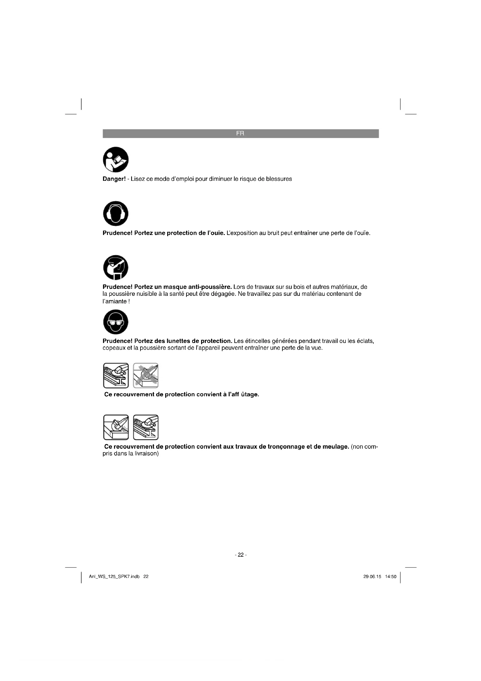 Danger! - Lisez ce mode d’emploi pour diminuer le risque de blessures Prudence! Portez une protection de l’ouïe. L’exposition au bruit peut entraîner une perte de l’ouïe. Prudence! Portez des lunettes de protection. Les étincelles générées pendant travail ou les éclats, copeaux et la poussière sortant de l’appareil peuvent entraîner une perte de la vue. Prudence! Portez un masque anti-poussière. Lors de travaux sur su bois et autres matériaux, de la poussière nuisible à la santé peut être dégagée. Ne travaillez pas sur du matériau contenant de l’amiante ! Ce recouvrement de protection convient aux travaux de tronçonnage et de meulage. (non com- pris dans la livraison) Ce recouvrement de protection convient à l’aff ûtage. Anl_WS_125_SPK7.indb 22Anl_WS_125_SPK7.indb 22 29.06.15 14:5029.06.15 14:50FR