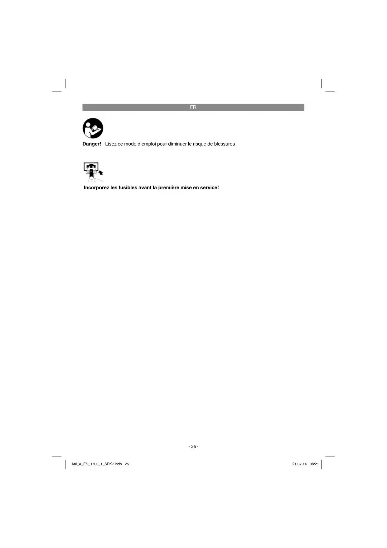 Danger! - Lisez ce mode d’emploi pour diminuer le risque de blessures Incorporez les fusibles avant la première mise en service! Anl_A_ES_1700_1_SPK7.indb 25Anl_A_ES_1700_1_SPK7.indb 25 21.07.14 08:2121.07.14 08:21FR
