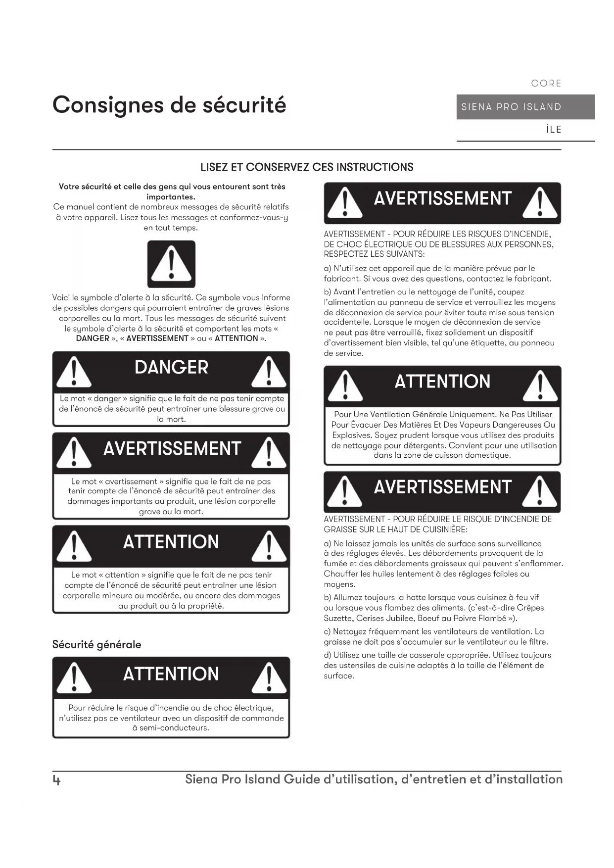 AVERTISSEMENT AVERTISSEMENT - POUR RÉDUIRE LE RISQUE DE BLESSURE DES PERSONNES EN CAS D’INCENDIE DE GRAISSE SUR LE HAUT DE LA CUISINIÈRE, RESPECTEZ CE QUI SUIT:a) DES FLAMMES PLUS INTELLIGENTES avec un couvercle bien ajusté, une plaque à biscuits ou un plateau en métal, puis éteignez le brûleur. FAITES ATTENTION À ÉVITER LES BRÛLURES. Si les flammes ne s’éteignent pas immédiatement, ÉVACUER ET APPELER LE DÉPARTEMENT DES INCENDIES.b) NE JAMAIS RAMASSER UNE PLAQUE ENFLAMME - Vous pourriez être brûlé.c) N’UTILISEZ PAS D’EAU, ni de torchons ou de serviettes humides - une violente explosion de vapeur en résultera.d) Utilisez un extincteur UNIQUEMENT si:1) Vous savez que vous possédez un extincteur de classe ABC et vous savez déjà comment l’utiliser. 2) Le feu est petit et contenu dans la zone où il a commencé. 3) Le service d’incendie est appelé. 4) Vous pouvez combattre le feu dos à une sortieBasé sur “Kitchen Firesafety Tips” publié par la NFPA. AVERTISSEMENT AVERTISSEMENT - POUR RÉDUIRE LES RISQUES D’INCENDIE, DE DÉCHARGE ÉLECTRIQUE OU DE BLESSURES AUX PERSONNES, RESPECTEZ CE QUI SUIT:a) Les travaux d’installation et le câblage électrique doivent être eectués par des personnes qualifiées conformément à tous les codes et normes applicables, y compris la construction résistant au feu.b) Une quantité d’air susante est nécessaire pour une combustion et une évacuation correctes des gaz par le conduit de fumée (cheminée) de l’équipement à combustible pour empêcher le refoulement. Suivez les directives et les normes de sécurité du fabricant de l’équipement de chauage, telles que celles publiées par la National Fire Protection Association (NFPA), l’American Society for Heating, Refrigeration and Air Conditioning Engineers (ASHRAE) et les autorités locales du code.c) Lorsque vous coupez ou percez dans un mur ou un plafond, n’endommagez pas le câblage électrique et les autres services publics cachés.d) Les ventilateurs à conduit doivent toujours être ventilés vers l’extérieur.e) Si cet appareil doit être installé au-dessus d’une baignoire ou d’une douche, il doit être marqué comme approprié pour l’application et être connecté à un circuit de dérivation protégé par un disjoncteur de fuite à la terre (GFCI). AVERTISSEMENT AVERTISSEMENTPOUR RÉDUIRE LES RISQUES D’INCENDIE, UTILISEZ UNIQUEMENT DES CONDUITS MÉTALLIQUES. ATTENTION Pour réduire les risques d’incendie et pour évacuer correctement l’air extérieur, ne pas évacuer l’air évacué dans les espaces à l’intérieur des murs, plafonds, greniers, vides sanitaires ou garages. AVERTISSEMENT Prop. 65 Avertissement pour les résidents de Californie: Ce produit peut contenir des produits chimiques reconnus par l’État de Californie comme pouvant provoquer le cancer, des malformations congénitales ou d’autres troubles de la reproduction.6 Siena Pro Island Guide d’utilisation, d’entretien et d’installation