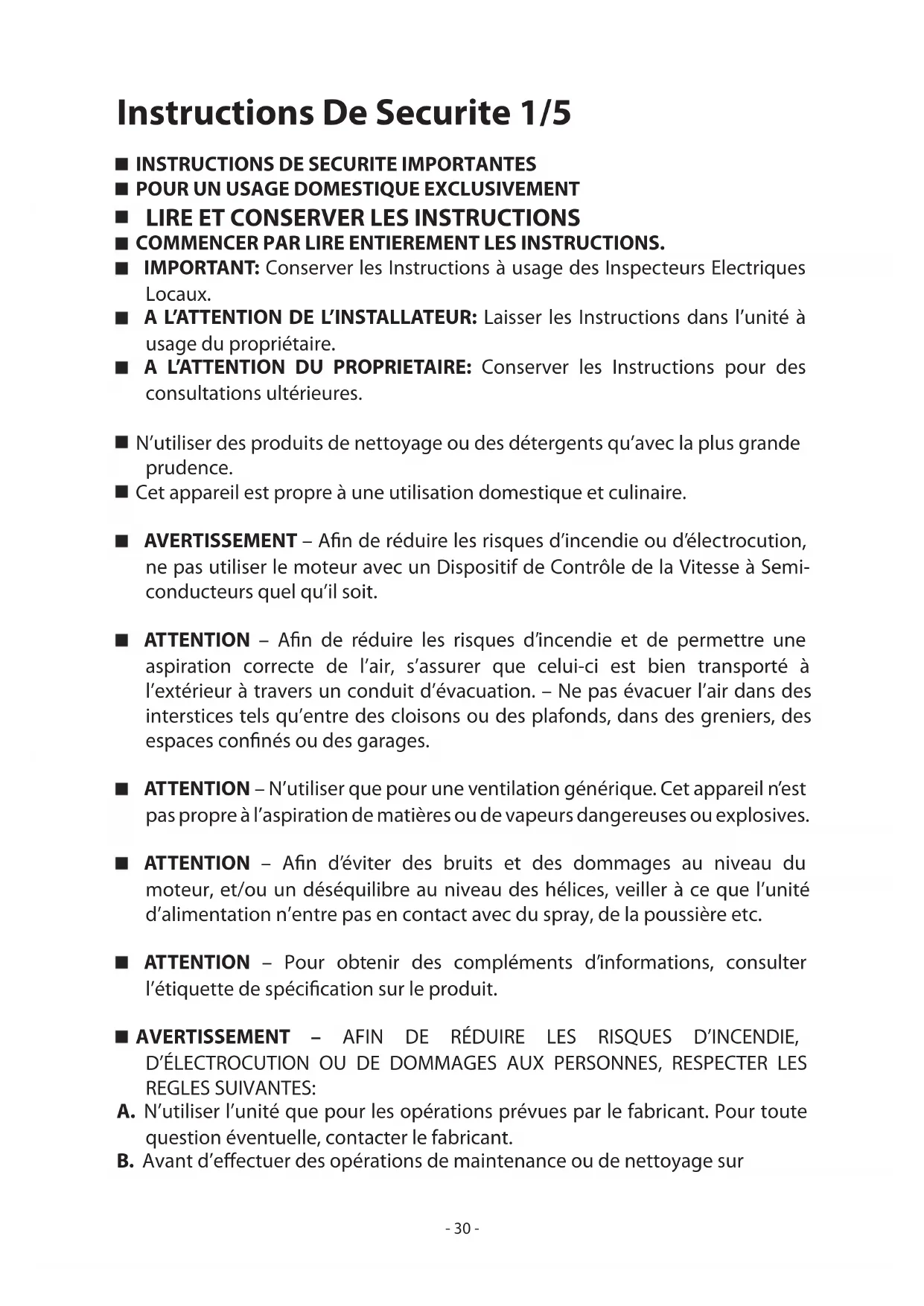 COMMENCER PAR LIRE ENTIEREMENT LES INSTRUCTIONS. IMPORTANT: Conserver les Instructions à usage des Inspecteurs Electriques Locaux. A L’ATTENTION DE L’INSTALLATEUR: Laisser les Instructions dans l’unité à usage du propriétaire. A L’ATTENTION DU PROPRIETAIRE: Conserver les Instructions pour des consultations ultérieures. N’utiliser des produits de nettoyage ou des détergents qu’avec la plus grande prudence. Cet appareil est propre à une utilisation domestique et culinaire. AVERTISSEMENT – Afin de réduire les risques d’incendie ou d’électrocution, ne pas utiliser le moteur avec un Dispositif de Contrôle de la Vitesse à Semi- conducteurs quel qu’il soit. ATTENTION – Afin de réduire les risques d’incendie et de permettre une aspiration correcte de l’air, s’assurer que celui-ci est bien transporté à l’extérieur à travers un conduit d’évacuation. – Ne pas évacuer l’air dans des interstices tels qu’entre des cloisons ou des plafonds, dans des greniers, des espaces confinés ou des garages. ATTENTION – N’utiliser que pour une ventilation générique. Cet appareil n’est pas propre à l’aspiration de matières ou de vapeurs dangereuses ou explosives. ATTENTION – Afin d’éviter des bruits et des dommages au niveau du moteur, et/ou un déséquilibre au niveau des hélices, veiller à ce que l’unité d’alimentation n’entre pas en contact avec du spray, de la poussière etc. ATTENTION – Pour obtenir des compléments d’informations, consulter l’étiquette de spécification sur le produit. AVERTISSEMENT – AFIN DE RÉDUIRE LES RISQUES D’INCENDIE, D’ÉLECTROCUTION OU DE DOMMAGES AUX PERSONNES, RESPECTER LES REGLES SUIVANTES: A. N’utiliser l’unité que pour les opérations prévues par le fabricant. Pour toute question éventuelle, contacter le fabricant. B. Avant d’effectuer des opérations de maintenance ou de nettoyage sur Instructions De Securite 1/5 - 30 -l’unité, débrancher le panneau de service et fermer à clef les commandes de déconnection afin d’éviter toute mise sous tension accidentelle. Au cas où les commandes de déconnection ne pourraient être fermées à clef, fixer sur lepanneau de service un message avertissant du danger, par exemple une plaque. AVERTISSEMENT – AFIN DE RÉDUIRE LES RISQUES D’INCENDIE PAR INFLAMMATION DES GRAISSES PRESENTES SUR LA GAZINIERE: A. Ne jamais laisser de casseroles sur feu vif sans surveillance. D’éventuels débordements dus à une forte ébullition peuvent provoquer de la fumée et des dépôts de graisses susceptibles de prendre feu. Réchauffer l’huile lentement, à petit feu ou moyen. B. ALLUMER systématiquement la hotte pour cuisiner à des températures élevées ou pour flamber des aliments (ex. : Crêpes Suzette, Cherries Jubilee – cerises flambées au brandy et glace -, Boeuf flambé au poivre). C. Nettoyer souvent le moteur. Eviter que les graisses ne s’accumulent sur le moteur ou sur le filtre. D. Utiliser des plats aux dimensions adaptées. Toujours utiliser des ustensiles de cuisine adaptés à la taille de la casserole qui se trouve sur la cuisinière. E. Veiller à ce que le moteur, les filtres et la surface où viennent s’accumuler les graisses restent propres. F. N’utiliser une flamme élevée que lorsque cela est nécessaire. Réchauffer l’huile lentement, à faible ou moyenne température. G. Ne jamais laisser la cuisinière sans surveillance pendant la cuisson. H. Utiliser systématiquement des ustensiles de cuisine adaptés au type et à la quantité d’aliments que l’on prépare. AVERTISSEMENT – AFIN DE RÉDUIRE LES RISQUES DE DOMMAGES AUX PERSONNES EN CAS D’INCENDIE PAR INFLAMMATION DES GRAISSES PRESENTES SUR LA CUISINIERE, RESPECTER LES REGLES SUIVANTES a: A. ETOUFFER LA FLAMME à l’aide d’un couvercle hermétique, une plaque à four ou un plateau en métal et éteindre le brûleur. PROCEDER AVEC LA PLUS GRANDE PRUDENCE AFIN D’EVITER TOUTE BRULURE. Si les flammes ne s’éteignent pas immédiatement, EVACUER LA PIECE ET APPELER LES POMPIERS. B. NE JAMAIS TOUCHER UN PLAT EN FEU – on risque de se brûler. C. NE PAS UTILISER D’EAU, ni de chiffons ou de serviettes humides – cela pourrait provoquer une violente explosion de vapeur. D. Utiliser un extincteur UNIQUEMENT dans les cas suivants: