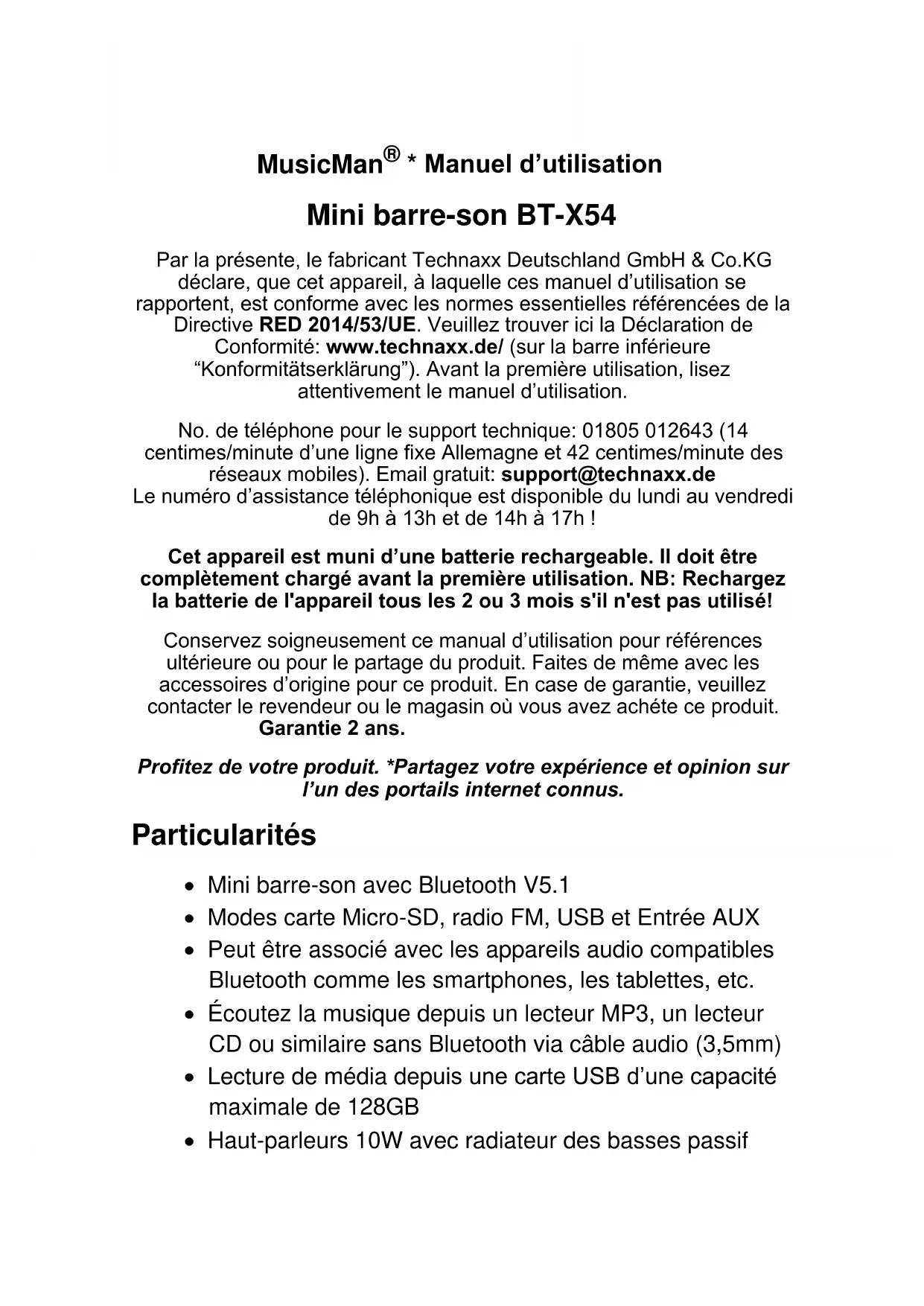 - Manuel d’utilisation Mini barre-son BT-X54 Par la présente, le fabricant Technaxx Deutschland GmbH & Co.KG déclare, que cet appareil, à laquelle ces manuel d’utilisation se rapportent, est conforme avec les normes essentielles référencées de la Directive RED 2014/53/UE. Veuillez trouver ici la Déclaration de Conformité: www.technaxx.de/ (sur la barre inférieure “Konformitätserklärung”). Avant la première utilisation, lisez attentivement le manuel d’utilisation. No. de téléphone pour le support technique: 01805 012643 (14 centimes/minute d’une ligne fixe Allemagne et 42 centimes/minute des réseaux mobiles). Email gratuit: support@technaxx.de Le numéro d’assistance téléphonique est disponible du lundi au vendredi de 9h à 13h et de 14h à 17h ! Cet appareil est muni d’une batterie rechargeable. Il doit être complètement chargé avant la première utilisation. NB: Rechargez la batterie de l'appareil tous les 2 ou 3 mois s'il n'est pas utilisé! Conservez soigneusement ce manual d’utilisation pour références ultérieure ou pour le partage du produit. Faites de même avec les accessoires d’origine pour ce produit. En case de garantie, veuillez contacter le revendeur ou le magasin où vous avez achéte ce produit. Garantie 2 ans. Profitez de votre produit. *Partagez votre expérience et opinion sur l’un des portails internet connus. Particularités
