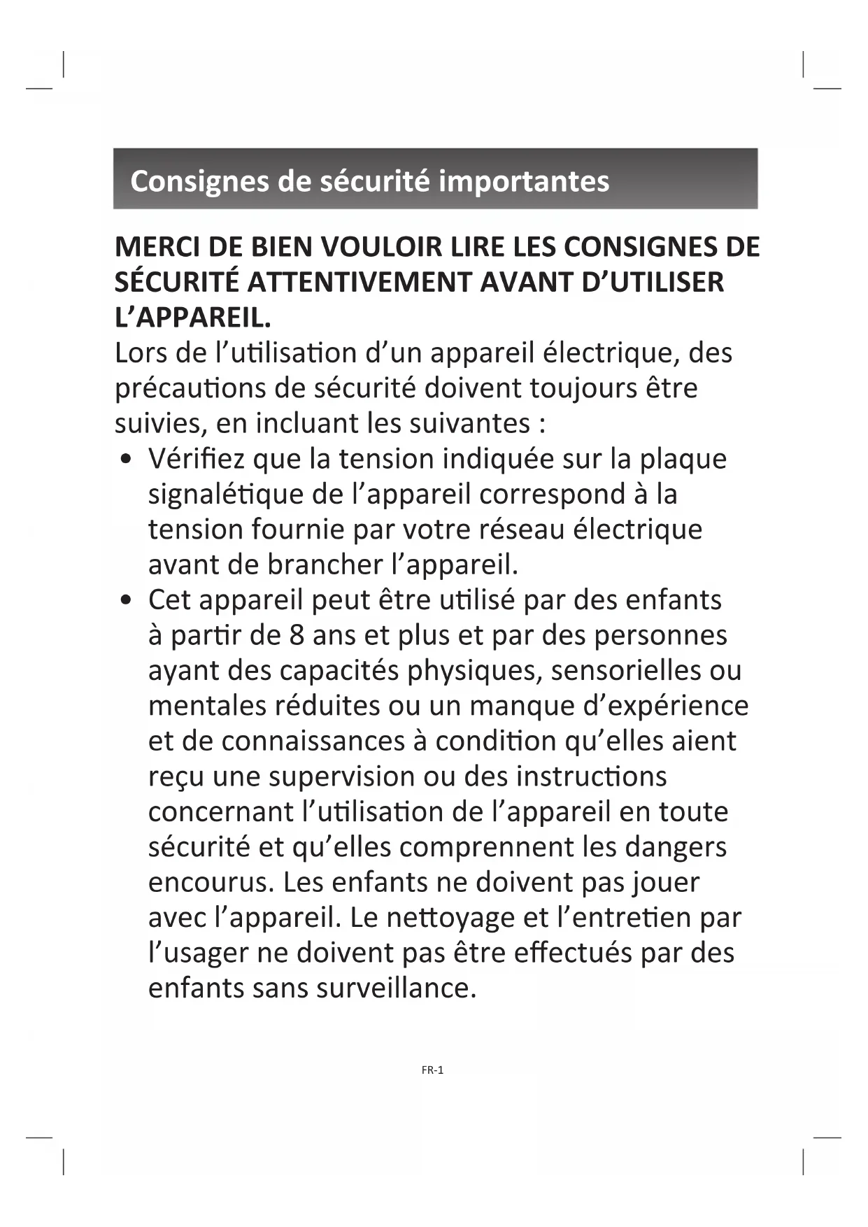 - Cet appareil peut être ulisé par des enfants à parr de 8 ans et plus et par des personnes ayant des capacités physiques, sensorielles ou mentales réduites ou un manque d’expérience et de connaissances à condion qu’elles aient reçu une supervision ou des instrucons concernant l’ulisaon de l’appareil en toute sécurité et qu’elles comprennent les dangers encourus. Les enfants ne doivent pas jouer avec l’appareil. Le neoyage et l’entreen par l’usager ne doivent pas être eectués par des enfants sans surveillance. FR-1• MISE EN GARDE: Ne pas uliser cet appareil près des baignoires, des douches, des lavabos ou autres récipients contenant de l’eau.