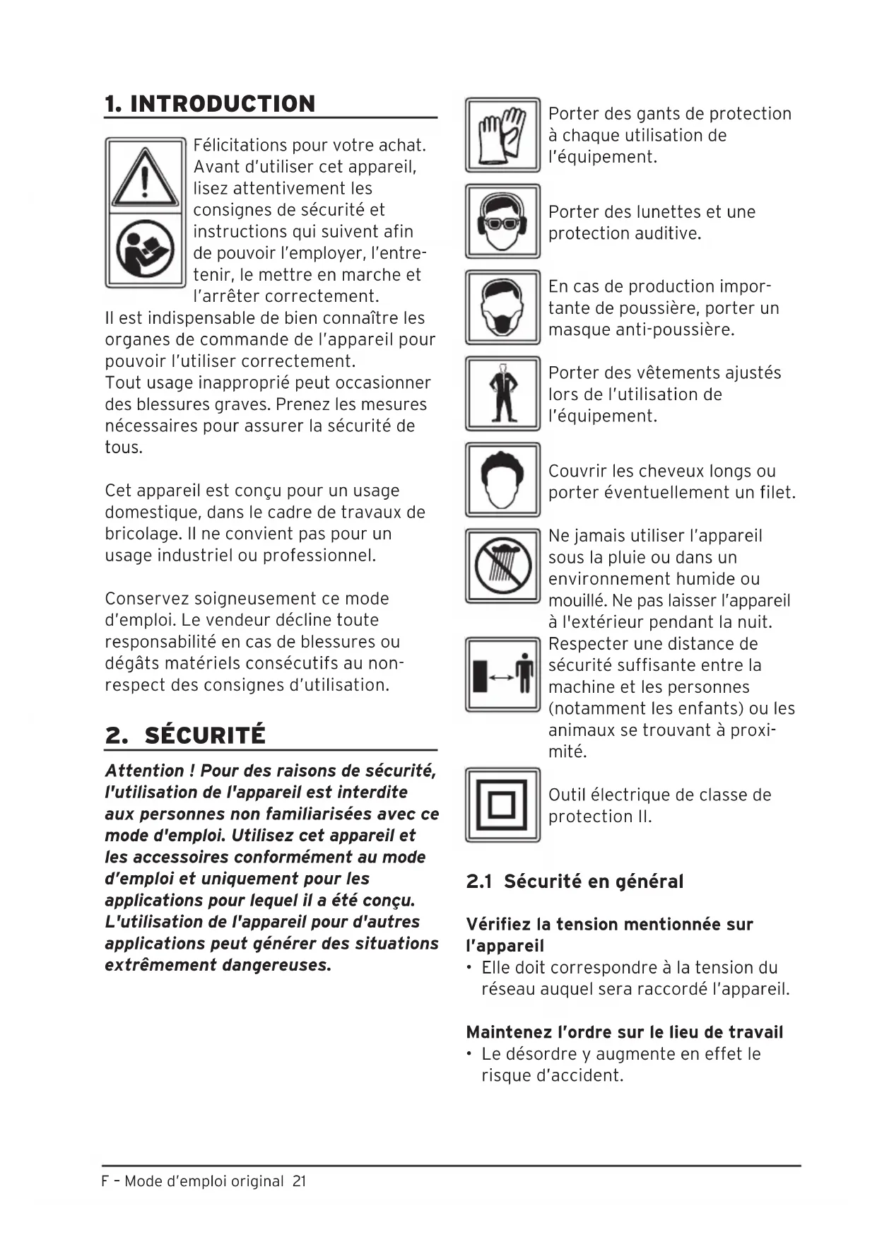 Porter des gants de protection à chaque utilisation de l’équipement. Porter des lunettes et une protection auditive. En cas de production impor- tante de poussière, porter un masque anti-poussière. Porter des vêtements ajustés lors de l’utilisation de l’équipement. Couvrir les cheveux longs ou porter éventuellement un filet. Ne jamais utiliser l’appareil sous la pluie ou dans un environnement humide ou mouillé. Ne pas laisser l’appareil à l'extérieur pendant la nuit. Respecter une distance de sécurité suffisante entre la machine et les personnes (notamment les enfants) ou les animaux se trouvant à proxi- mité. Outil électrique de classe de protection II.