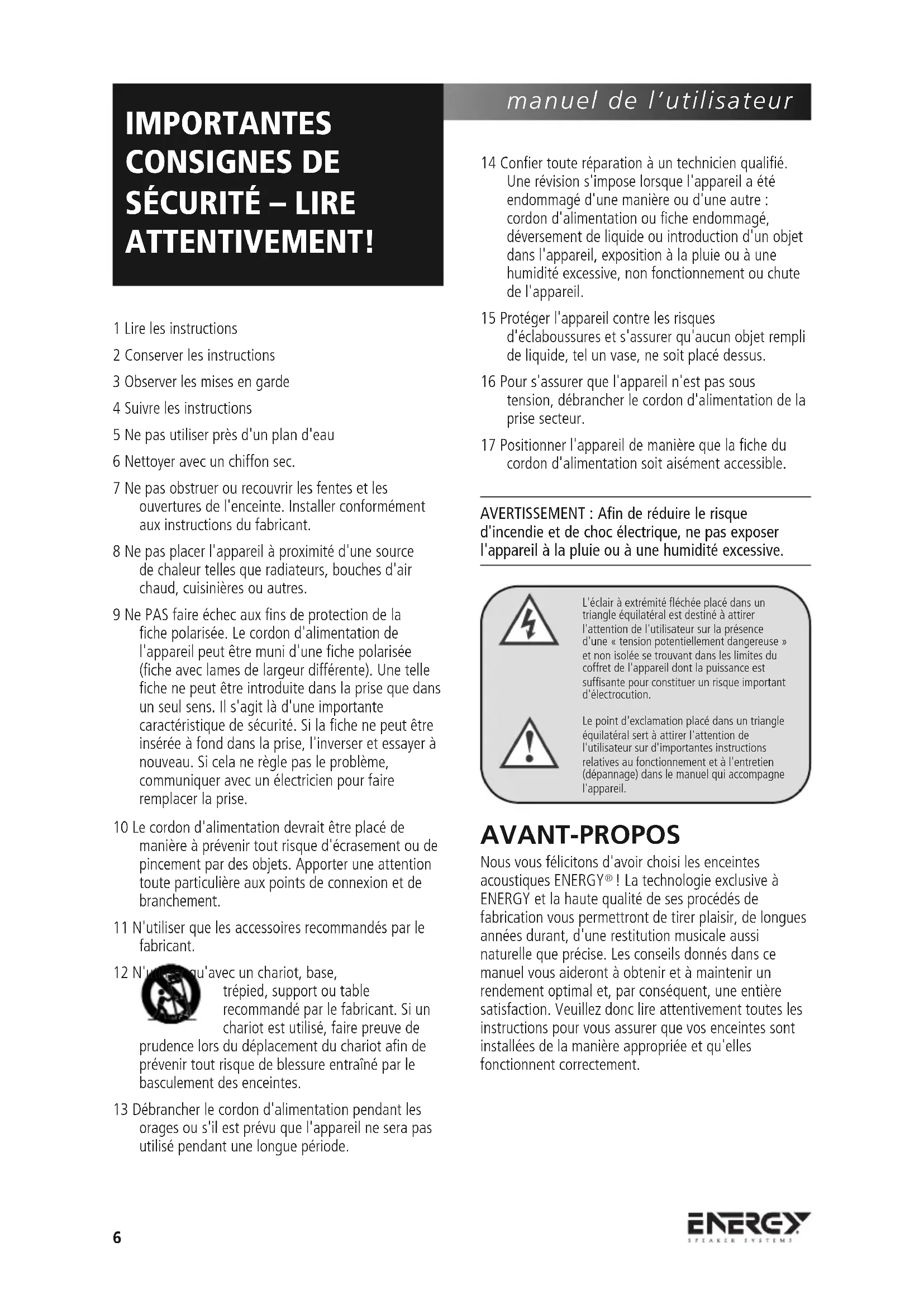 ! La technologie exclusive à ENERGY et la haute qualité de ses procédés de fabrication vous permettront de tirer plaisir, de longues années durant, d'une restitution musicale aussi naturelle que précise. Les conseils donnés dans ce manuel vous aideront à obtenir et à maintenir un rendement optimal et, par conséquent, une entière satisfaction. Veuillez donc lire attentivement toutes les instructions pour vous assurer que vos enceintes sont installées de la manière appropriée et qu'elles fonctionnent correctement. IMPORTANTES CONSIGNES DE