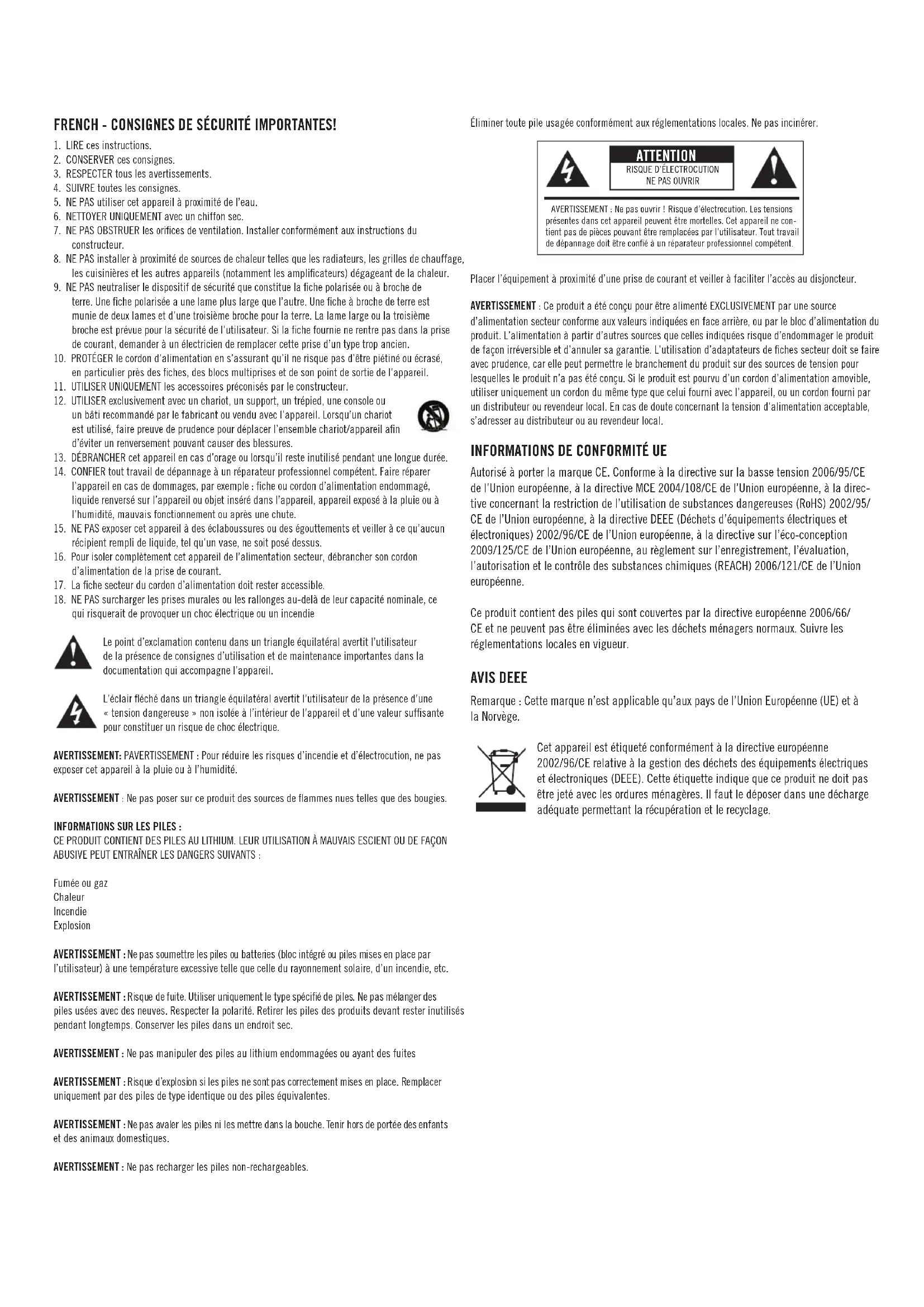Autorisé à porter la marque CE. Conforme à la directive sur la basse tension 2006/95/CE de l’Union européenne, à la directive MCE 2004/108/CE de l’Union européenne, à la direc- tive concernant la restriction de l’utilisation de substances dangereuses (RoHS) 2002/95/ CE de l’Union européenne, à la directive DEEE (Déchets d’équipements électriques et électroniques) 2002/96/CE de l’Union européenne, à la directive sur l’éco-conception 2009/125/CE de l’Union européenne, au règlement sur l’enregistrement, l’évaluation, l’autorisation et le contrôle des substances chimiques (REACH) 2006/121/CE de l’Union européenne. Ce produit contient des piles qui sont couvertes par la directive européenne 2006/66/ CE et ne peuvent pas être éliminées avec les déchets ménagers normaux. Suivre les réglementations locales en vigueur. AVIS DEEE Remarque : Cette marque n’est applicable qu’aux pays de l’Union Européenne (UE) et à la Norvège. Cet appareil est étiqueté conformément à la directive européenne 2002/96/CE relative à la gestion des déchets des équipements électriques et électroniques (DEEE). Cette étiquette indique que ce produit ne doit pas être jeté avec les ordures ménagères. Il faut le déposer dans une décharge adéquate permettant la récupération et le recyclage. ATTENTION