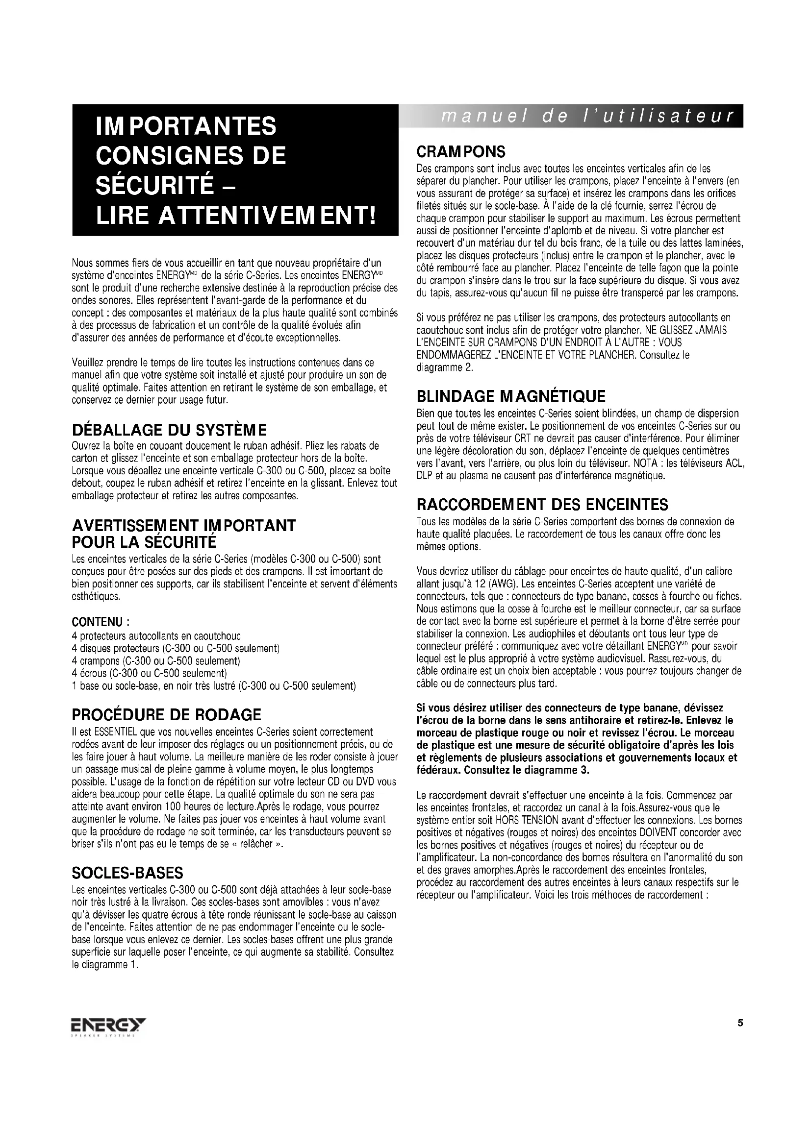 Il est ESSENTIEL que vos nouvelles enceintes C-Series soient correctement rodées avant de leur imposer des réglages ou un positionnement précis, ou de les faire jouer à haut volume. La meilleure manière de les roder consiste à jouer un passage musical de pleine gamme à volume moyen, le plus longtemps possible. L'usage de la fonction de répétition sur votre lecteur CD ou DVD vous aidera beaucoup pour cette étape. La qualité optimale du son ne sera pas atteinte avant environ 100 heures de lecture.Après le rodage, vous pourrez augmenter le volume. Ne faites pas jouer vos enceintes à haut volume avant que la procédure de rodage ne soit terminée, car les transducteurs peuvent se briser s'ils n'ont pas eu le temps de se « relâcher ». SOCLES-BASES Les enceintes verticales C-300 ou C-500 sont déjà attachées à leur socle-base noir très lustré à la livraison. Ces socles-bases sont amovibles : vous n'avez qu'à dévisser les quatre écrous à tête ronde réunissant le socle-base au caisson de l'enceinte. Faites attention de ne pas endommager l'enceinte ou le socle- base lorsque vous enlevez ce dernier. Les socles-bases offrent une plus grande superficie sur laquelle poser l'enceinte, ce qui augmente sa stabilité. Consultez le diagramme 1. CRAMPONS Des crampons sont inclus avec toutes les enceintes verticales afin de les séparer du plancher. Pour utiliser les crampons, placez l'enceinte à l'envers (en vous assurant de protéger sa surface) et insérez les crampons dans les orifices filetés situés sur le socle-base. À l'aide de la clé fournie, serrez l'écrou de chaque crampon pour stabiliser le support au maximum. Les écrous permettent aussi de positionner l'enceinte d'aplomb et de niveau. Si votre plancher est recouvert d'un matériau dur tel du bois franc, de la tuile ou des lattes laminées, placez les disques protecteurs (inclus) entre le crampon et le plancher, avec le côté rembourré face au plancher. Placez l'enceinte de telle façon que la pointe du crampon s'insère dans le trou sur la face supérieure du disque. Si vous avez du tapis, assurez-vous qu'aucun fil ne puisse être transpercé par les crampons. Si vous préférez ne pas utiliser les crampons, des protecteurs autocollants en caoutchouc sont inclus afin de protéger votre plancher. NE GLISSEZ JAMAIS L'ENCEINTE SUR CRAMPONS D'UN ENDROIT À L'AUTRE : VOUS ENDOMMAGEREZ L'ENCEINTE ET VOTRE PLANCHER. Consultez le diagramme 2.