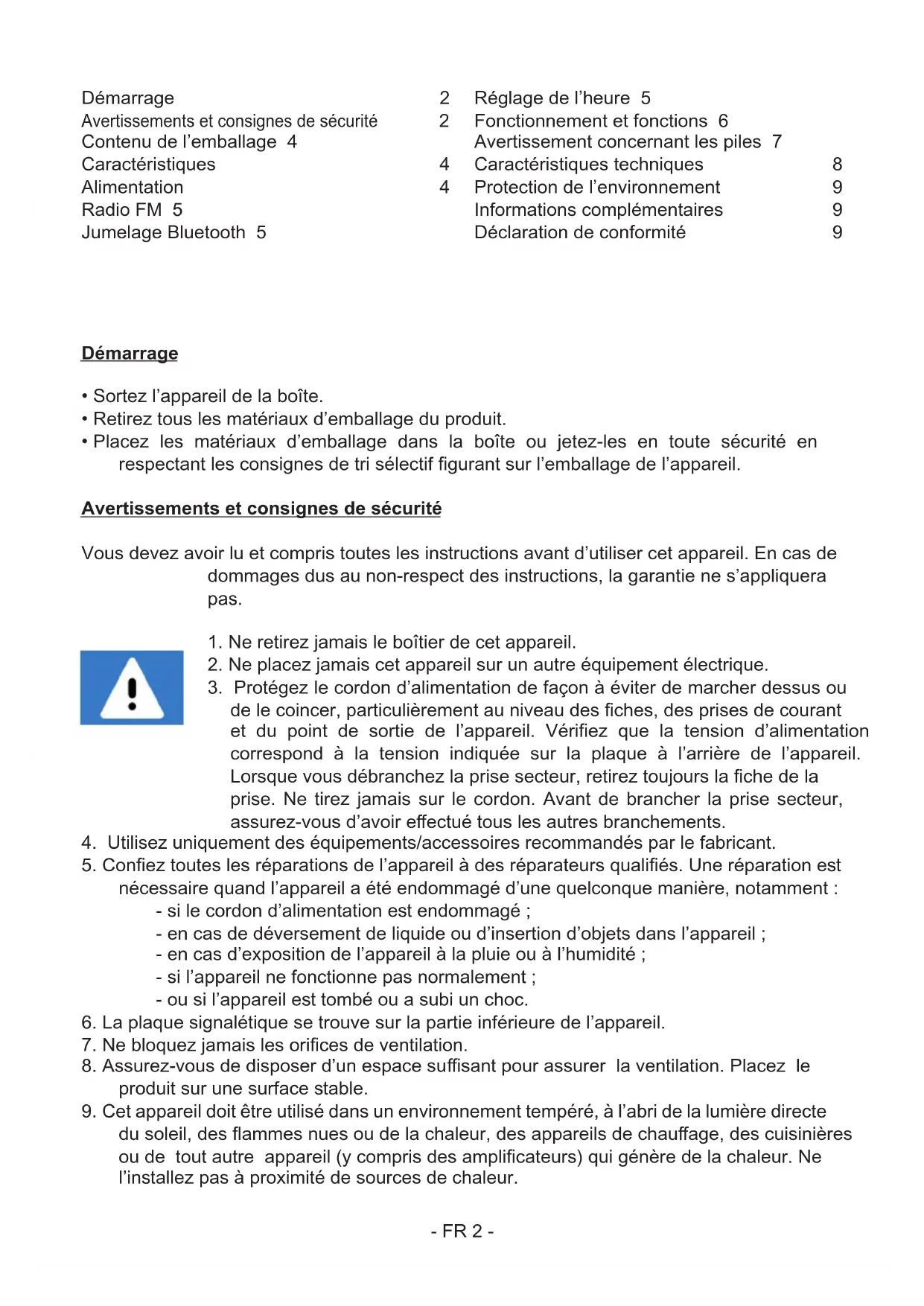 Contenu de l’emballage 4 Caractéristiques 4 Alimentation 4 Radio FM 5 Jumelage Bluetooth 5 Réglage de l’heure 5 Fonctionnement et fonctions 6 Avertissement concernant les piles 7 Caractéristiques techniques 8 Protection de l’environnement 9 Informations complémentaires 9 Déclaration de conformité 9- FR 3 -