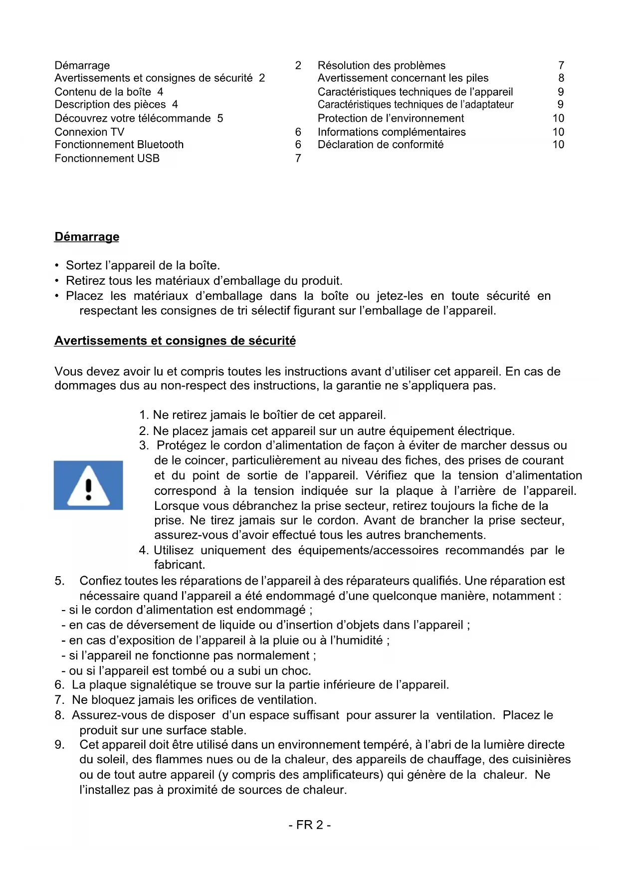 du soleil, des ammes nues ou de la chaleur, des appareils de chauage, des cuisinières ou de tout autre appareil (y compris des amplicateurs) qui génère de la chaleur. Ne l’inallez pas à proximité de sources de chaleur. Démarrage 2 Avertissements et consignes de sécurité 2 Contenu de la boîte 4 Description des pièces 4 Découvrez votre télécommande 5 Connexion TV 6 Fonctionnement Bluetooth 6 Fonctionnement USB 7 Résolution des problèmes 7 Avertissement concernant les piles 8 Caractéristiques techniques de l’appareil