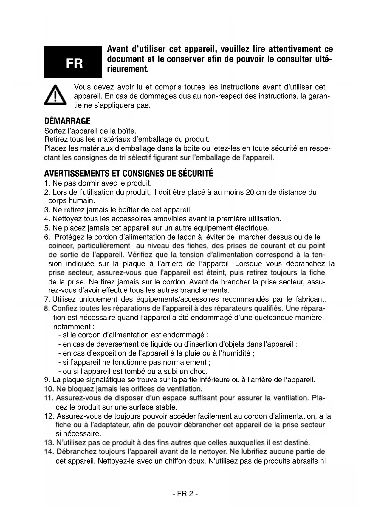 AVANT D’UTILISER CET APPAREIL, VEUILLEZ LIRE ATTENTIVEMENT CE MODE D’EMPLOI ET LE CONSERVER AFIN DE POUVOIR LE CONSULTER ULTÉRIEUREMENT.- FR 2 - Avant d’utiliser cet appareil, veuillez lire attentivement ce document et le conserver D¾Q de pouvoir le consulter ulté- rieurement. Vous devez avoir lu et compris toutes les instructions avant d’utiliser cet appareil. En cas de dommages dus au non-respect des instructions, la garan- tie ne s’appliquera pas. DÉMARRAGE Sortez l’appareil de la boîte. Retirez tous les matériaux d’emballage du produit. Placez les matériaux d’emballage dans la boîte ou jetez-les en toute sécurité en respe-