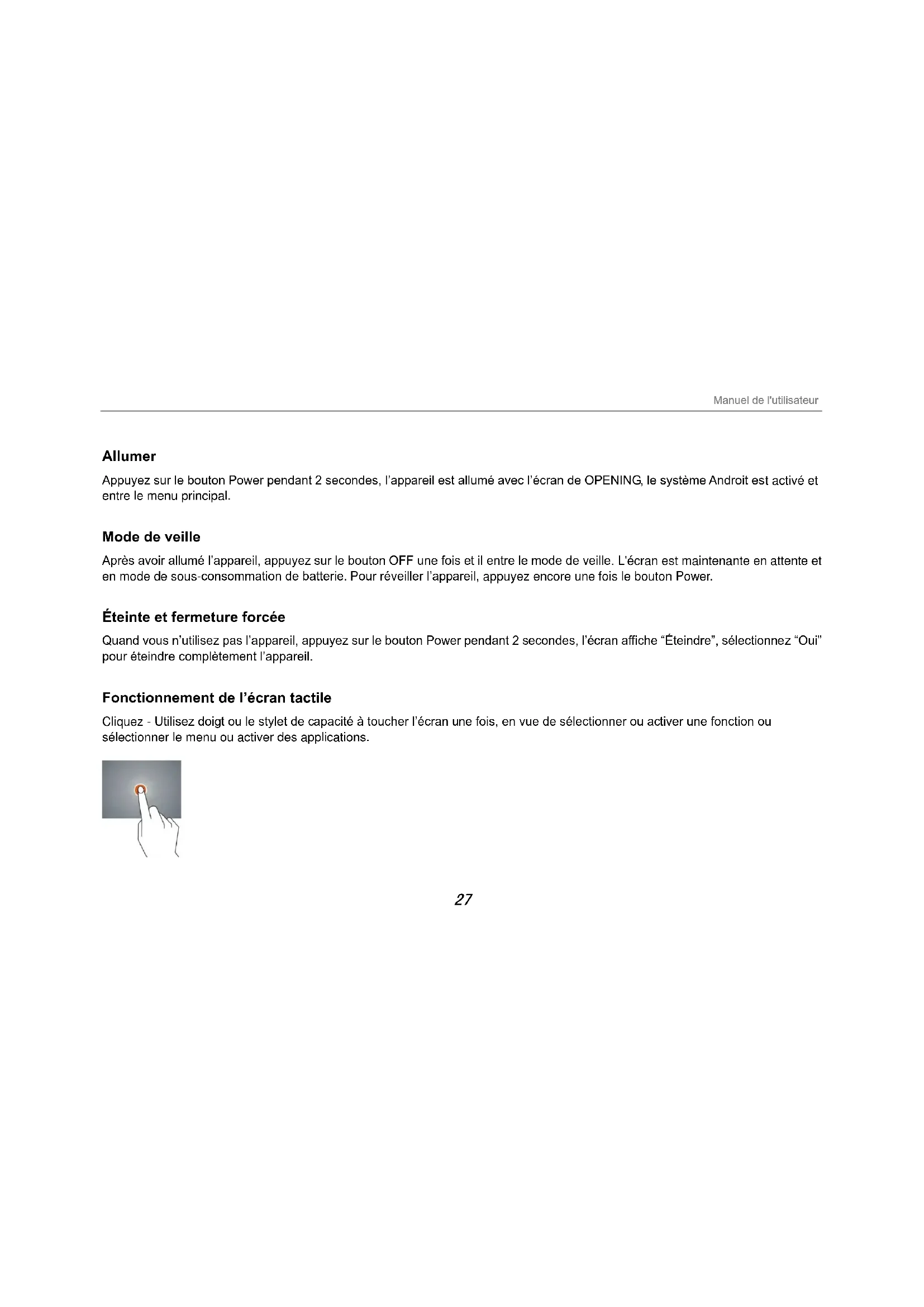 Allumer Appuyez sur le bouton Power pendant 2 secondes, l’appareil est allumé avec l’écran de OPENING, le système Androit est activé et entre le menu principal. Mode de veille Après avoir allumé l’appareil, appuyez sur le bouton OFF une fois et il entre le mode de veille. L'écran est maintenante en attente et en mode de sous-consommation de batterie. Pour réveiller l’appareil, appuyez encore une fois le bouton Power. Éteinte et fermeture forcée Quand vous n’utilisez pas l’appareil, appuyez sur le bouton Power pendant 2 secondes, l’écran affiche “Éteindre”, sélectionnez “Oui” pour éteindre complètement l’appareil. Fonctionnement de l’écran tactile Cliquez - Utilisez doigt ou le stylet de capacité à toucher l’écran une fois, en vue de sélectionner ou activer une fonction ou sélectionner le menu ou activer des applications.0 0DQXHOGHOXWLOLVDWHXU
