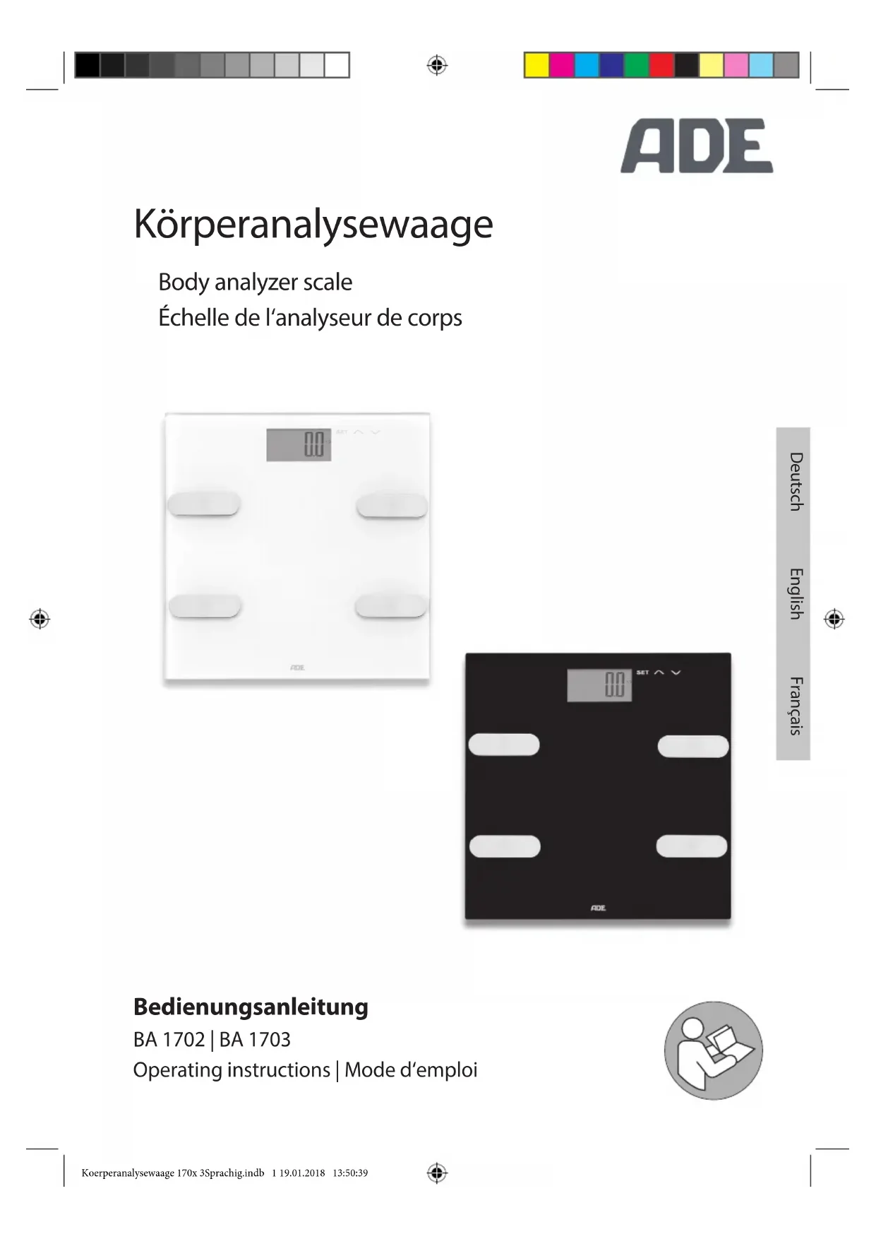 Balance d'analyse corporelle BA 1702 | BA 1703 Chère cliente, cher client! Nous sommes ravis que vous ayez choisi un appareil de haute qualité de la marque ADE, qui allie des fonctions intelligentes à un design exceptionnel. Cette balance d’analyse corporelle vous permet de mieux vous connaître et de mesurer votre corps. Les années d'expérience de la marque ADE garantissent une haute technicité et une qualité éprouvée. Nous vous souhaitons beaucoup de plaisir lors de l'utilisation de la balance et la lecture de vos mesures! L’équipe ADE Généralités À propos de ce mode d'emploi Ce mode d'emploi décrit l'utilisation conforme ainsi que les procédures d'entretien de l'article. Conservez ce manuel pour toute référence ultérieure. Si vous cédez l’article à une tierce personne, transmettez-lui également ce mode d’emploi. Le non-respect de ce mode d'emploi peut entraîner des blessures ou endommager l'article. Légende Ce symbole, associé au mot DANGER, prévient de blessures graves. Ce symbole, associé au mot ATTENTION, prévient de blessures moyennes et légères. Ce symbole, associé au mot AVERTISSEMENT, prévient de dommages matériels. Ce symbole désigne des informations supplémentaires ainsi que des indications d'ordre général. Koerperanalysewaage 170x 3Sprachig.indb 34 19.01.2018 13:50:44Table des matières