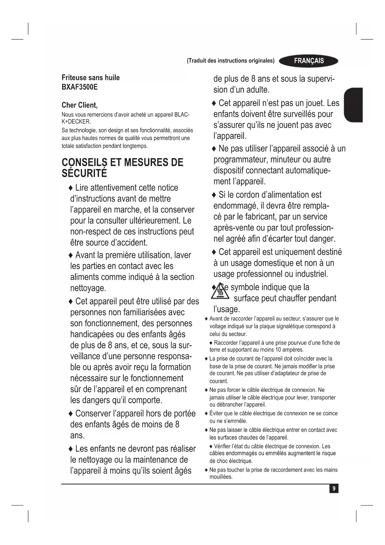Friteuse sans huile BXAF3500E Cher Client, Nous vous remercions d’avoir acheté un appareil BLAC- K+DECKER. Sa technologie, son design et ses fonctionnalité, associés aux plus hautes normes de qualité vous permettront une totale satisfaction pendant longtemps.