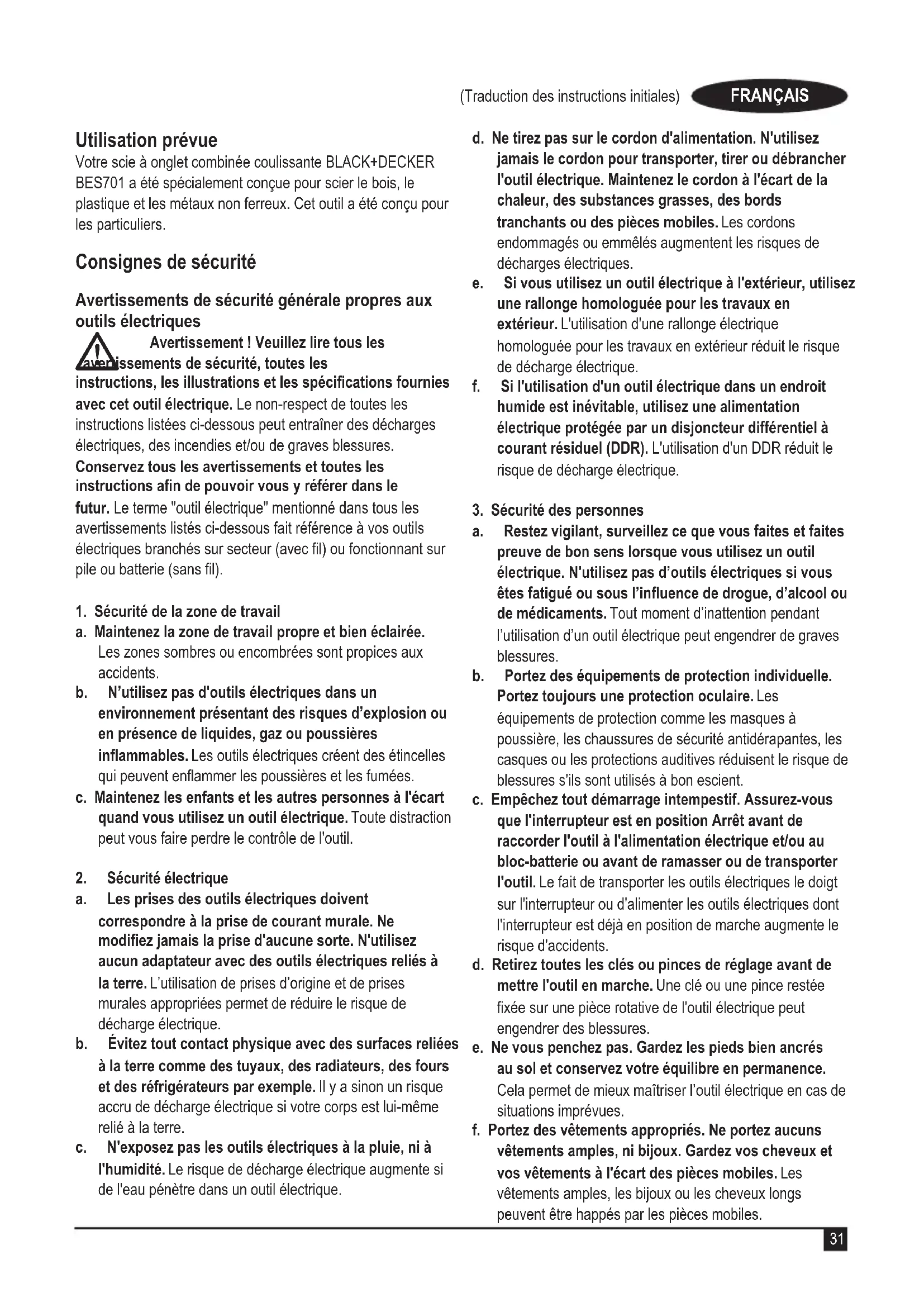 BES701 - Scie électrique BLACK & DECKER - Notice d'utilisation et mode d'emploi gratuit