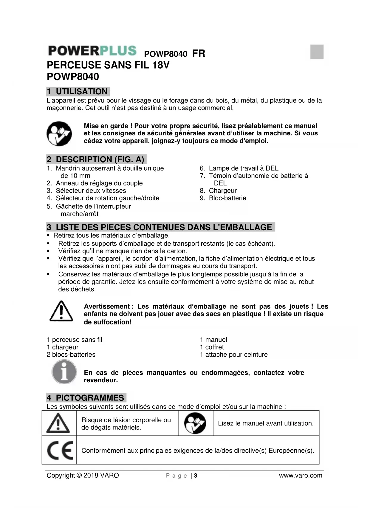 VARO N.V. - Joseph Van Instraat 9 - BE2500 Lier - BELGIQUE, déclare que : Appareil : Perceuse à percussion sans fil Marque : POWERplus Modèles : POWP8040 est en conformité avec les exigences essentielles et les autres dispositions pertinentes des Directives européennes applicables, basées sur l'application des normes européennes harmonisées. Toute modification non autorisée de l'appareil annule cette déclaration. Directives européennes (y compris, le cas échéant, leurs amendements à la date de la signature) ; 2014/30/EU 2006/42/CE 2011/65/EU Normes européennes harmonisées (y compris, le cas échéant, leurs amendements à la date de la signature) ; EN60745-1 : 2009 EN60745-2-1 : 2010 EN60745-2-2 : 2010 EN55014-1 : 2006 EN55014-2 : 2015 Détenteur de la Documentation technique : Philippe Vankerkhove, VARO – Vic. Van Rompuy N.V. Le soussigné agit au nom du PDG de l'entreprise, Hugo Cuypers Réglementation – Directeur de la conformité Date : 17/01/2018POWP8040 EN Copyright © 2018 VARO P a g e | 1 www.varo.com 1 APPLICATION ................................................................................ 3