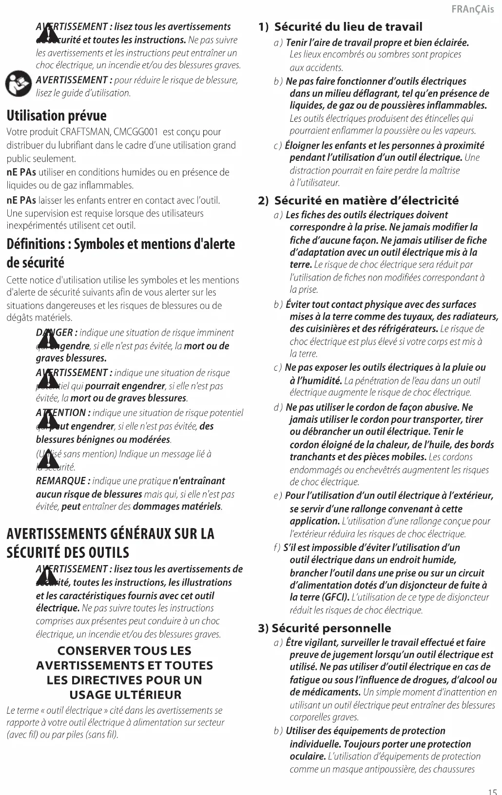 (Utilisé sans mention) Indique un message lié à lasécurité. REMARQUE: indique une pratique n'entraînant aucun risque de blessures mais qui, si elle n'est pas évitée, peut entraîner des dommagesmatériels. Utilisation prévue Votre produit CRAFTSMAN, CMCGG001 est conçu pour distribuer du lubrifiant dans le cadre d’une utilisation grand public seulement. nE PAs utiliser en conditions humides ou en présence de liquides ou de gaz inflammables. nE PAs laisser les enfants entrer en contact avec l’outil. Une supervision est requise lorsque des utilisateurs inexpérimentés utilisent cet outil. Français (traduction de la notice d’instructions originale)