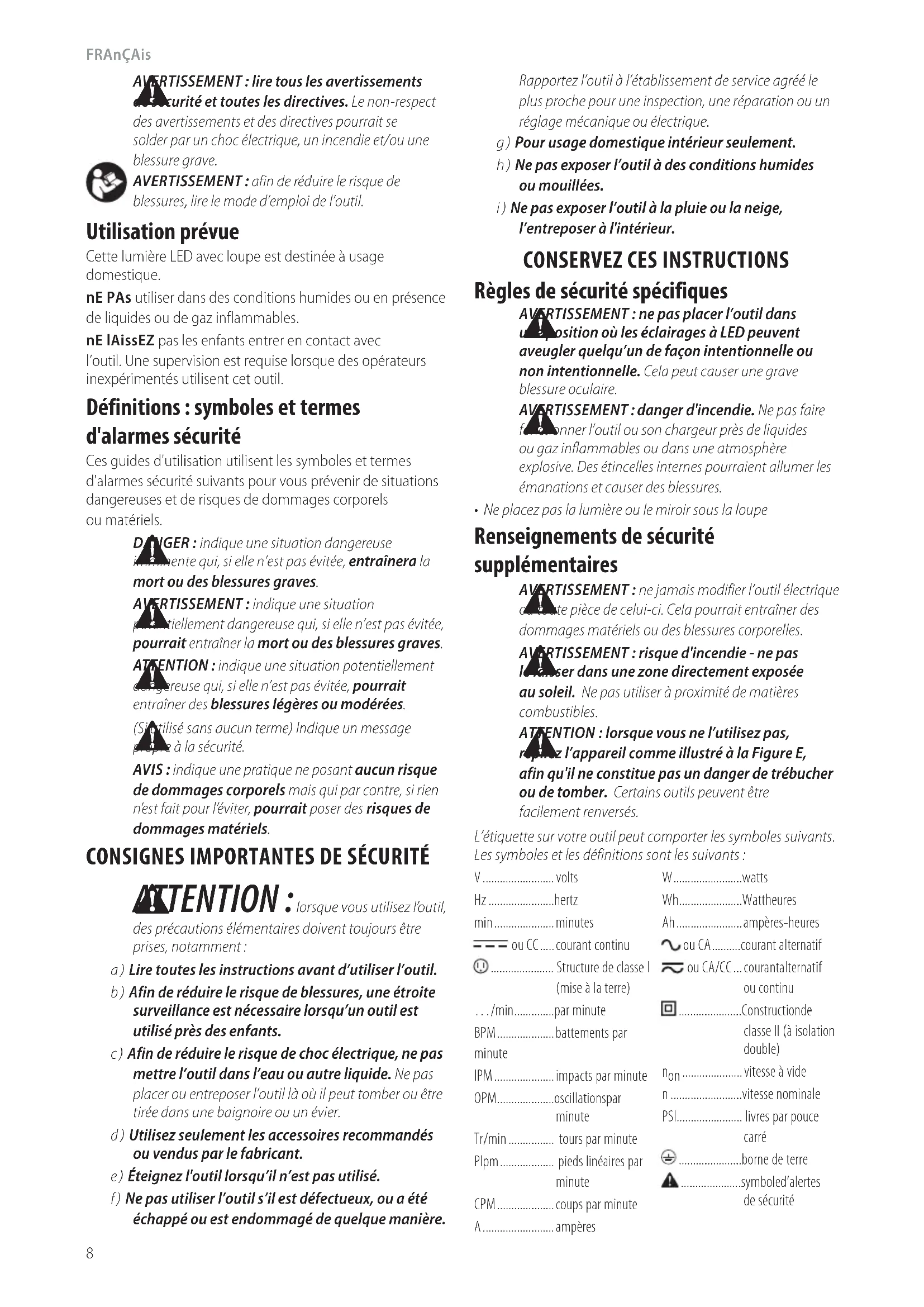 (Si utilisé sans aucun terme) Indique un message propre à lasécurité. AVIS : indique une pratique ne posant aucun risque de dommages corporels mais qui par contre, si rien n’est fait pour l’éviter, pourrait poser des risques de dommagesmatériels. Utilisation prévue Cette lumière LED avec loupe est destinée à usage domestique. nE PAs utiliser dans des conditions humides ou en présence de liquides ou de gaz inflammables. nE lAissEZ pas les enfants entrer en contact avec l’outil. Une supervision est requise lorsque des opérateurs inexpérimentés utilisent cet outil.FRAnçAis