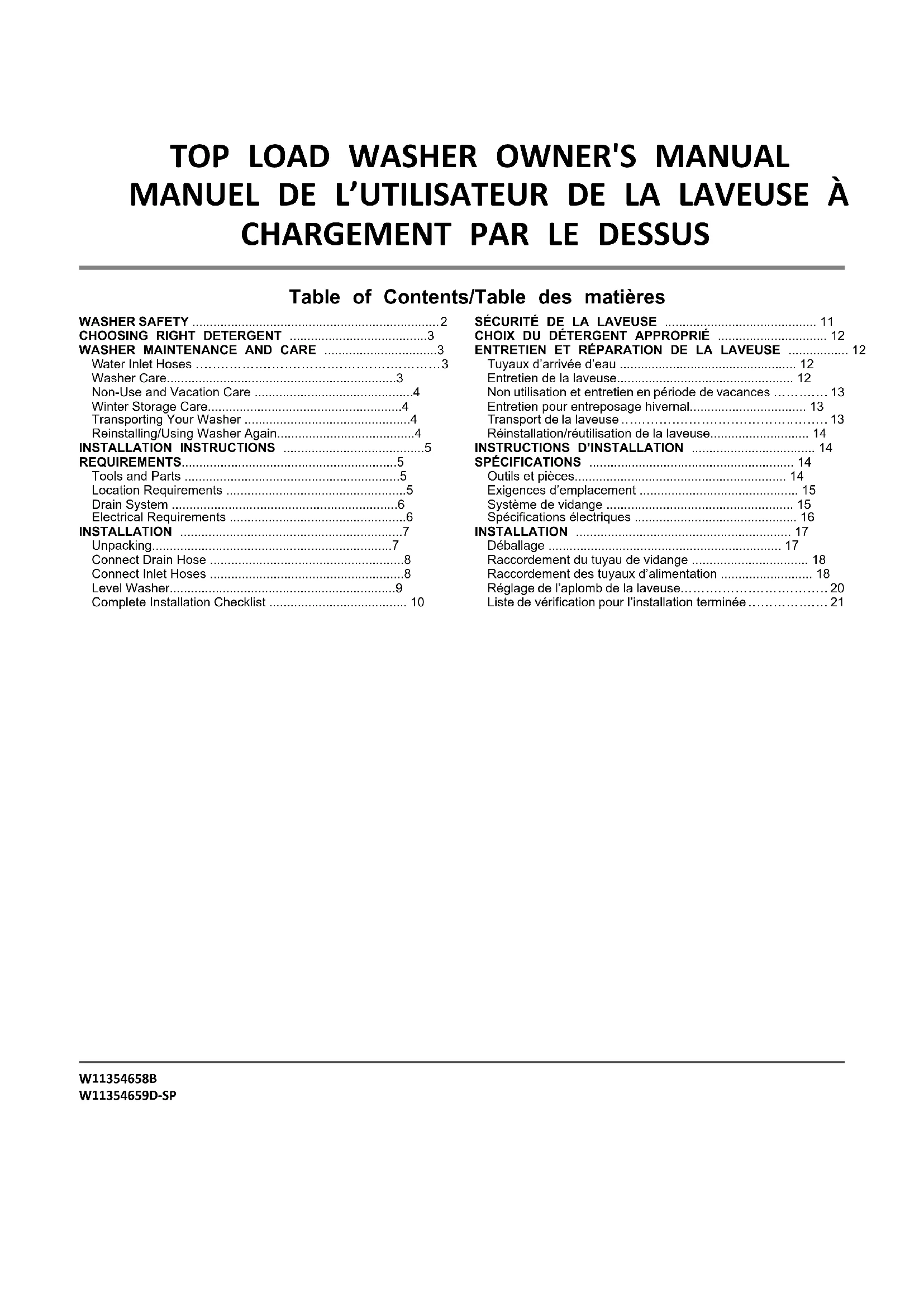terreListe de vérification pour l’installation terminée ■ Consulter les spécifications électriques. S’assurer de disposer d’une source d’électricité appropriée, et d’une liaison à la terre conforme à la méthode recommandée. ■ Vérifier que toutes les pièces sont maintenant installées. S’il reste une pièce, passer en revue les différentes étapes pour découvrir laquelle aurait été oubliée. ■ Vérifier la présence de tous les outils. ■ Vérifier que tout le matériel d’expédition a été retiré de la laveuse. ■ Vérifier que la laveuse est de niveau. ■ Vérifier que les robinets d’eau sont ouverts. ■ Vérifier qu’il n’y a pas de fuite autour des robinets et des tuyaux d’arrivée d’eau. ■ Ôter la pellicule protectrice de la console et tout ruban adhésif resté sur la laveuse. ■ Vérifier que la laveuse est branchée sur une prise de courant à 3 alvéoles reliée à la terre. ■ Éliminer/recycler tous les matériaux d’emballage. ■ Lire la section « Entretien et réparation de la laveuse ». ■ Pour tester et nettoyer la laveuse, mesurer la moitié de la quantité normale recommandée de détergent en poudre ou liquide HE et la verser dans le panier de la laveuse ou le distributeur de détergent (sur certains modèles). Fermer le couvercle. Sélectionner n’importe quel programme. Mettre la laveuse en marche et la laisser exécuter un programme complet. 21NOTESNOTESNOTES W11354658B W11354659D-SP ©2023 All rights reserved. Used under license in Canada. Tous droits réservés. Utilisé sous licence au Canada. 05/23
