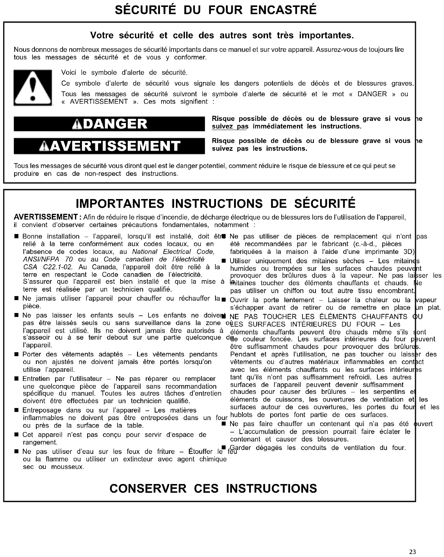Sécurité du four encastré................ 23