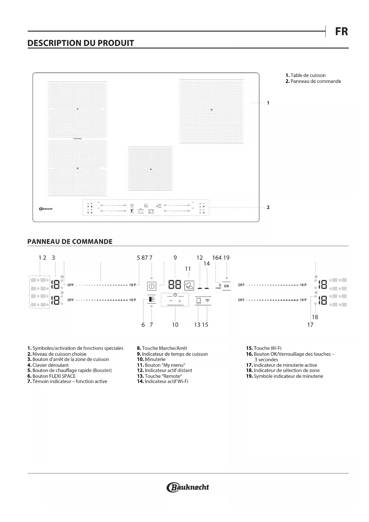 Cet appareil respecte les conditions requises d'écoconception de la Réglementation européenne 66/2014 et des Réglementations en matière d'écoconception pour les produits liés à l'énergie et les informations énergétiques (Amendement) (Sortie de l'UE) 2019, conformément à la norme européenne EN 60350-2. REMARQUE Les porteurs d'un pacemaker ou d'un dispositif médical similaire doivent faire attention lorsqu'ils se trouvent près de cette plaque à induction allumée. Le champ électromagnétique peut aecter le pacemaker ou ledit dispositif similaire. Consultez votre médecin, ou le fabricant du pacemaker ou du dispositif médical similaire pour plus d'informations sur les eets des champs électromagnétiques de la plaque à induction. Le Fabricant, Whirlpool Management Emea S.r.l., déclare que le présent I100 EMEA modèle d‘appareil électroménager avec équipement radio est conforme à la directive 2014/53/UE et aux Réglementations relatives à l'équipement radio de 2017. Le texte complet de la déclaration de conformité est présent sur le site internet suivant: https://docs.bauknecht.eu. L‘équipement radio fonctionne sur la bande de fréquence de 2,4 GHz ISM, la puissance de radio-fréquence maximale transmise ne dépasse pas 20 dBm (p.i.r.e). Ce produit comprend un logiciel libre développé par des tiers. La déclaration d‘utilisation de la licence libre est disponible sur le site internet suivant: https://docs.bauknecht.eu.INSTALLATION