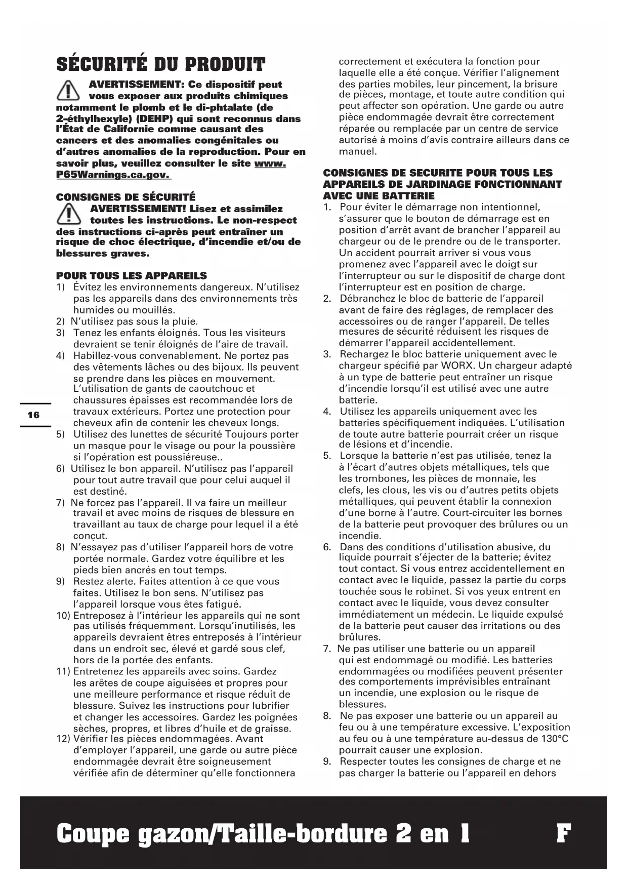 SYMBOLES Par mesure de sécurité, enlevez la batterie avant de remplacer des accessoires. Afin de réduire les risques de blessure, l’utilisateur doit lire ce mode d’emploi Portez une protection auditive Portez un protecteur oculaire Ne pas jeter au feu Les batteries peuvent s’introduire dans le cycle de l’eau si elles sont éliminées de manière inappropriée, ce qui peut être dangereux pour l’écosystème. Ne pas éliminer les batteries usagées avec les déchets municipaux non triés Batterie Li-ion. Les batteries doivent être recyclées en collecte sélective. POSITEC Inc. a formé un partenariat avec RBRC Corporation pour le recyclage des batteries Positec portant le sceau RBRC-call2recycle. Pour la protection de l’environnement, veillez à ne pas jeter les batteries aux poubelles. À la fin du cycle de vie de la batterie, appelez 1-800-822-8837 pour un service gratuit qui mettra la batterie au rebut selon les règles de l’art. Tonte de bordure Tonte Verrouiller DéverrouillerF Coupe gazon/Taille-bordure 2 en 1