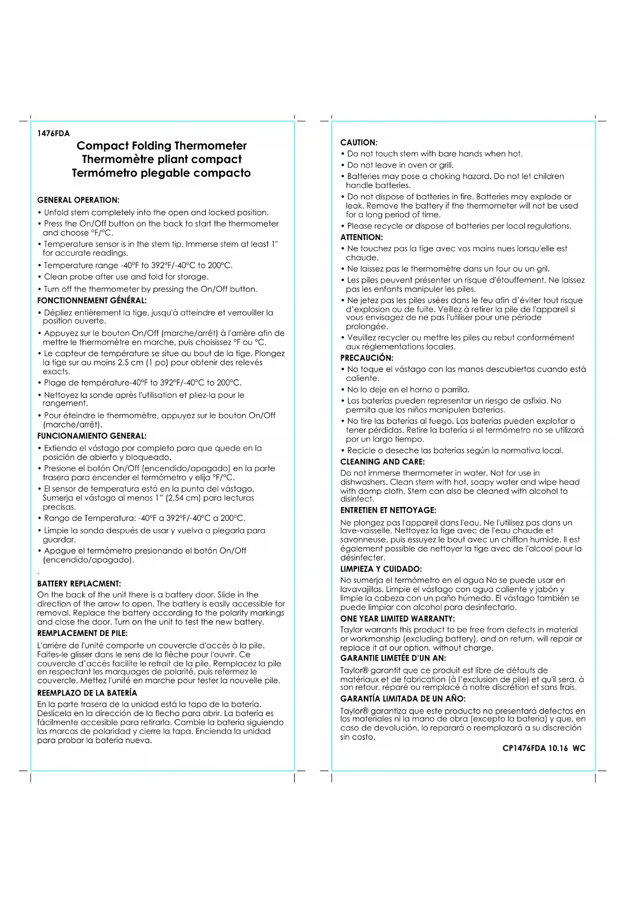 Téléchargez la notice de votre Thermomètre au format PDF gratuitement ! Retrouvez votre notice 1476 - Taylor et reprennez votre appareil électronique en main. Sur cette page sont publiés tous les documents nécessaires à l'utilisation de votre appareil 1476 de la marque Taylor.