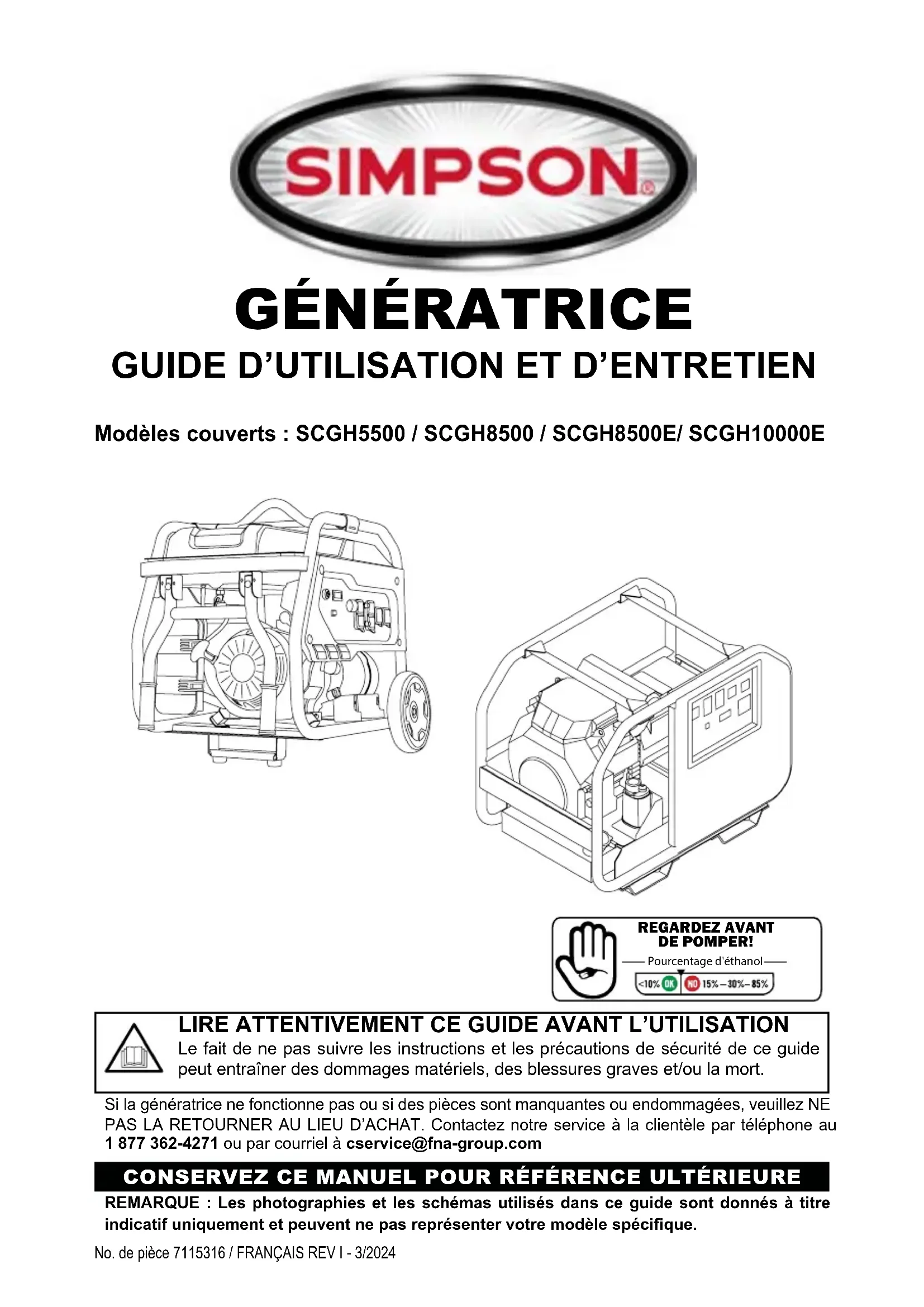 Modèles couverts : SCGH5500 / SCGH8500 / SCGH8500E/ SCGH10000E CONSERVEZ CE MANUEL POUR RÉFÉRENCE ULTÉRIEURE LIRE ATTENTIVEMENT CE GUIDE AVANT L’UTILISATION Le fait de ne pas suivre les instructions et les précautions de sécurité de ce guide peut entraîner des dommages matériels, des blessures graves et/ou la mort.REMARQUE : Les photographies et les schémas utilisés dans ce guide sont donnés à titre indicatif uniquement et peuvent ne pas représenter votre modèle spécique.Si la génératrice ne fonctionne pas ou si des pièces sont manquantes ou endommagées, veuillez NE PAS LA RETOURNER AU LIEU D’ACHAT. Contactez notre service à la clientèle par téléphone au 1 877 362-4271 ou par courriel à cservice@fna-group.comREGARDEZ AVANTDE POMPER!Pourcentage d'éthanolPage II REMARQUES Ce produit et les gaz d’échappement du moteur peuvent vous exposer à des produits chimiques connus dans l’État de Californie pour provoquer des cancers, des anomalies congénitales ou d’autres problèmes de reproduction. Pour plus d’informations sur la proposition 65 de l’État de Californie, consultez le site www.P65Warnings.ca.gov.