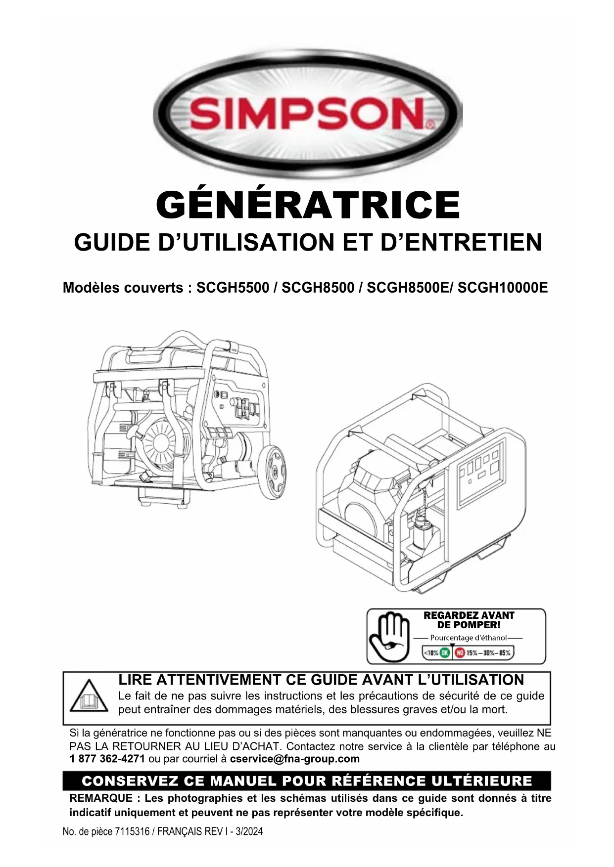 Modèles couverts : SCGH5500 / SCGH8500 / SCGH8500E/ SCGH10000E CONSERVEZ CE MANUEL POUR RÉFÉRENCE ULTÉRIEURE LIRE ATTENTIVEMENT CE GUIDE AVANT L’UTILISATION Le fait de ne pas suivre les instructions et les précautions de sécurité de ce guide peut entraîner des dommages matériels, des blessures graves et/ou la mort.REMARQUE : Les photographies et les schémas utilisés dans ce guide sont donnés à titre indicatif uniquement et peuvent ne pas représenter votre modèle spécique.Si la génératrice ne fonctionne pas ou si des pièces sont manquantes ou endommagées, veuillez NE PAS LA RETOURNER AU LIEU D’ACHAT. Contactez notre service à la clientèle par téléphone au 1 877 362-4271 ou par courriel à cservice@fna-group.comREGARDEZ AVANTDE POMPER!Pourcentage d'éthanolPage II REMARQUES Ce produit et les gaz d’échappement du moteur peuvent vous exposer à des produits chimiques connus dans l’État de Californie pour provoquer des cancers, des anomalies congénitales ou d’autres problèmes de reproduction. Pour plus d’informations sur la proposition 65 de l’État de Californie, consultez le site www.P65Warnings.ca.gov.