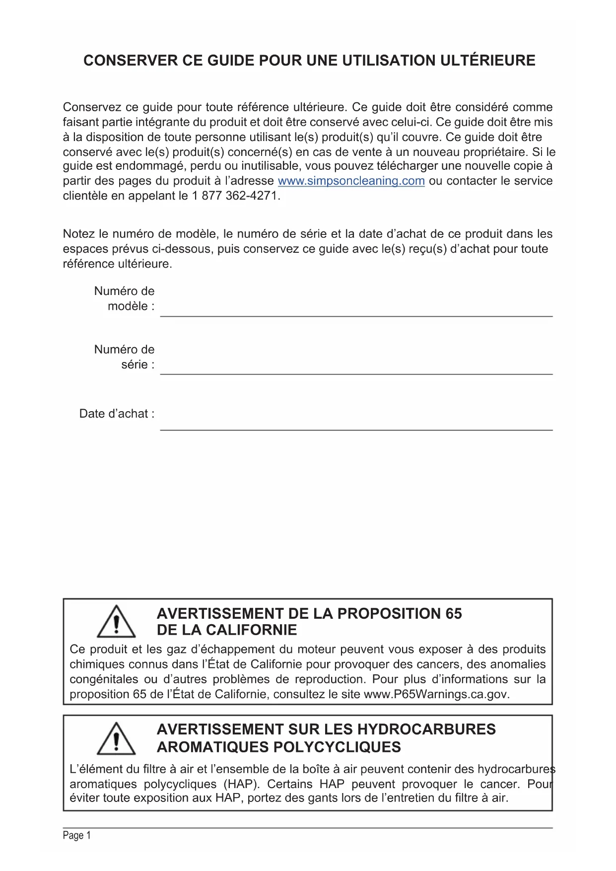 AROMATIQUES POLYCYCLIQUES L’élément du ltre à air et l’ensemble de la boîte à air peuvent contenir des hydrocarbures aromatiques polycycliques (HAP). Certains HAP peuvent provoquer le cancer. Pour éviter toute exposition aux HAP, portez des gants lors de l’entretien du ltre à air. Page 1 CONSERVER CE GUIDE POUR UNE UTILISATION ULTÉRIEURE Notez le numéro de modèle, le numéro de série et la date d’achat de ce produit dans les espaces prévus ci-dessous, puis conservez ce guide avec le(s) reçu(s) d’achat pour toute référence ultérieure. Conservez ce guide pour toute référence ultérieure. Ce guide doit être considéré comme faisant partie intégrante du produit et doit être conservé avec celui-ci. Ce guide doit être mis à la disposition de toute personne utilisant le(s) produit(s) qu’il couvre. Ce guide doit être conservé avec le(s) produit(s) concerné(s) en cas de vente à un nouveau propriétaire. Si le guide est endommagé, perdu ou inutilisable, vous pouvez télécharger une nouvelle copie à partir des pages du produit à l’adresse www.simpsoncleaning.com ou contacter le service clientèle en appelant le 1 877 362-4271. Numéro de modèle : Numéro de série : Date d’achat :Page 2 Réglage de la pression de surface