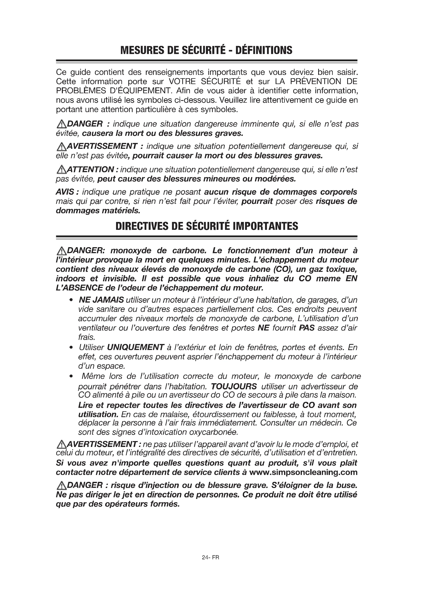 celui du moteur, et l’intégralité des directives de sécurité, d’utilisation et d’entretien. Si vous avez n'importe quelles questions quant au produit, s'il vous plaît contacter notre département de service clients à www.simpsoncleaning.com