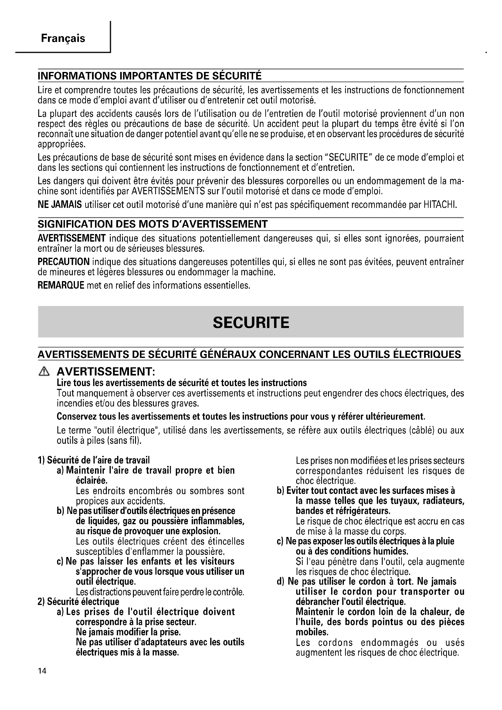 Lire et comprendre toutes les précautions de sécurité, les avertissements et les instructions de fonctionnement dans ce mode d’emploi avant d’utiliser ou d’entretenir cet outil motorisé. La plupart des accidents causés lors de l’utilisation ou de l’entretien de l’outil motorisé proviennent d’un non respect des règles ou précautions de base de sécurité. Un accident peut la plupart du temps être évité si l’on reconnaît une situation de danger potentiel avant qu’elle ne se produise, et en observant les procédures de sécurité appropriées. Les précautions de base de sécurité sont mises en évidence dans la section “SECURITE” de ce mode d’emploi et dans les sections qui contiennent les instructions de fonctionnement et d’entretien. Les dangers qui doivent être évités pour prévenir des blessures corporelles ou un endommagement de la ma- chine sont identifiés par AVERTISSEMENTS sur l’outil motorisé et dans ce mode d’emploi. NE JAMAIS utiliser cet outil motorisé d’une manière qui n’est pas spécifiquement recommandée par HITACHI.