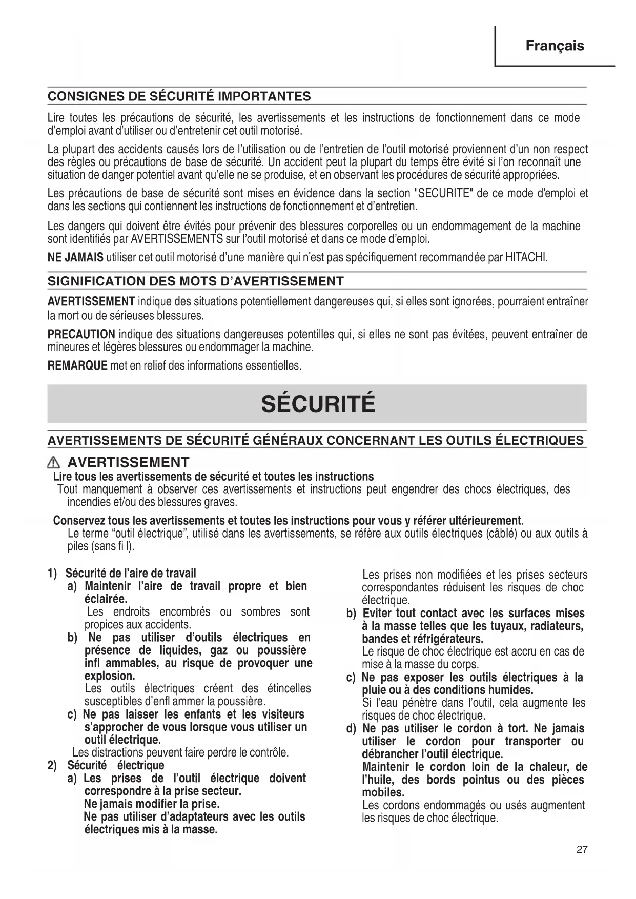 Lire toutes les précautions de sécurité, les avertissements et les instructions de fonctionnement dans ce mode d’emploi avant d’utiliser ou d’entretenir cet outil motorisé. La plupart des accidents causés lors de l’utilisation ou de l’entretien de l’outil motorisé proviennent d’un non respect des règles ou précautions de base de sécurité. Un accident peut la plupart du temps être évité si l’on reconnaît une situation de danger potentiel avant qu’elle ne se produise, et en observant les procédures de sécurité appropriées. Les précautions de base de sécurité sont mises en évidence dans la section "SECURITE" de ce mode d’emploi et dans les sections qui contiennent les instructions de fonctionnement et d’entretien. Les dangers qui doivent être évités pour prévenir des blessures corporelles ou un endommagement de la machine sont identifi és par AVERTISSEMENTS sur l’outil motorisé et dans ce mode d’emploi. NE JAMAIS utiliser cet outil motorisé d’une manière qui n’est pas spécifi quement recommandée par HITACHI.