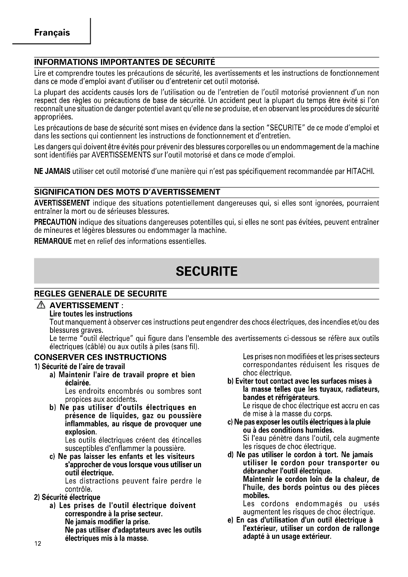 Lire et comprendre toutes les précautions de sécurité, les avertissements et les instructions de fonctionnement dans ce mode d’emploi avant d’utiliser ou d’entretenir cet outil motorisé. La plupart des accidents causés lors de l’utilisation ou de l’entretien de l’outil motorisé proviennent d’un non respect des règles ou précautions de base de sécurité. Un accident peut la plupart du temps être évité si l’on reconnaît une situation de danger potentiel avant qu’elle ne se produise, et en observant les procédures de sécurité appropriées. Les précautions de base de sécurité sont mises en évidence dans la section “SECURITE” de ce mode d’emploi et dans les sections qui contiennent les instructions de fonctionnement et d’entretien. Les dangers qui doivent être évités pour prévenir des blessures corporelles ou un endommagement de la machine sont identifiés par AVERTISSEMENTS sur l’outil motorisé et dans ce mode d’emploi. NE JAMAIS utiliser cet outil motorisé d’une manière qui n’est pas spécifiquement recommandée par HITACHI.