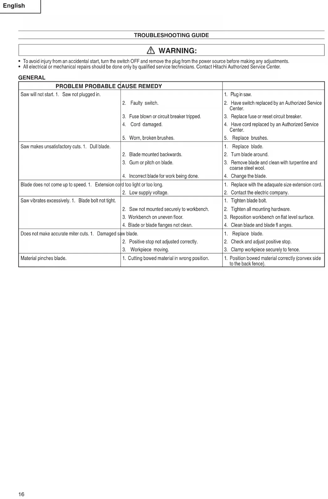 Toute réparation électrique ou mécanique doit être eff ectuée par un technicien d’entretien qualifi é. Contacter un centre de service autorisé de Hitachi. GENERAL