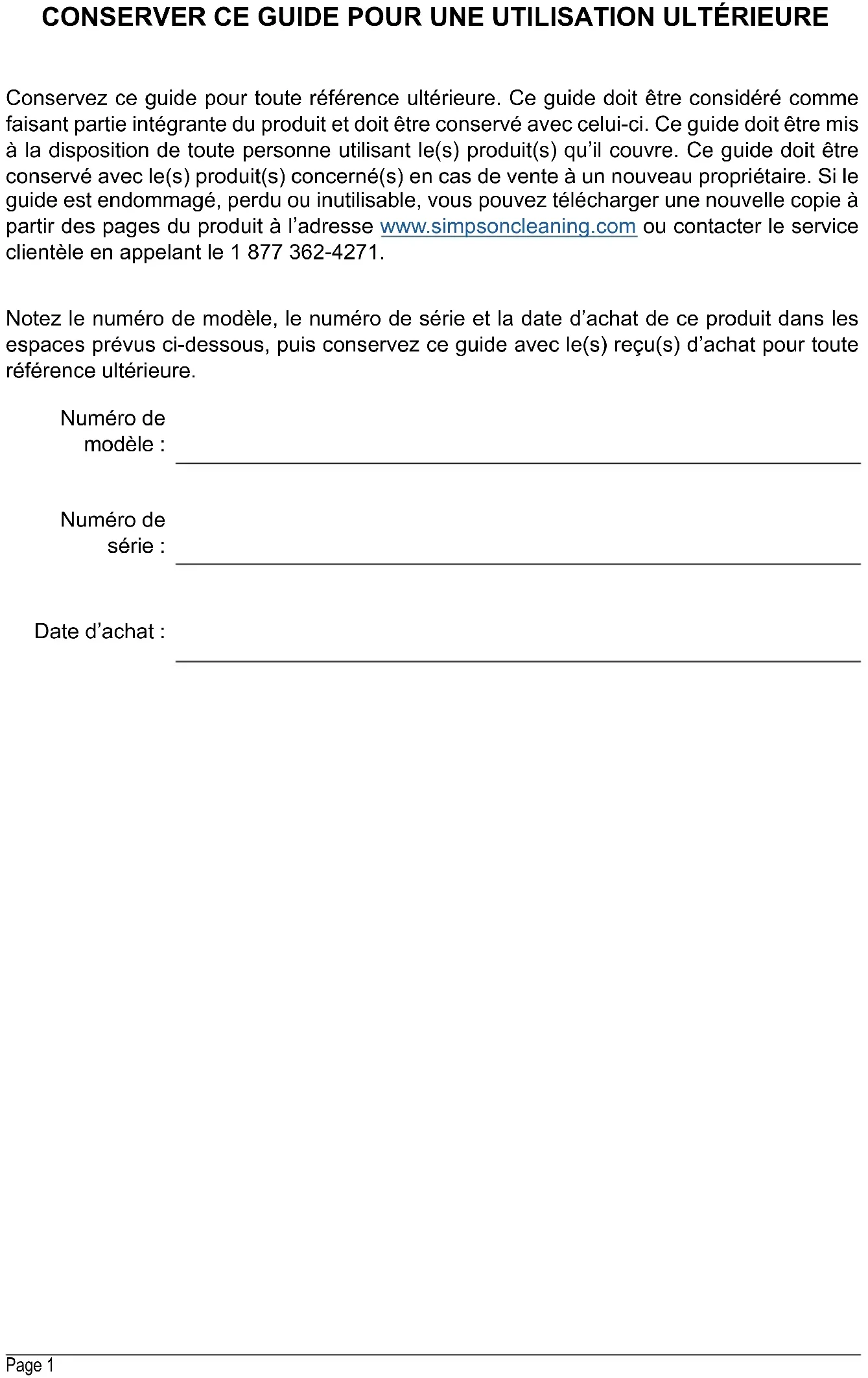 LIRE ATTENTIVEMENT CE GUIDE AVANT L’UTILISATION Le fait de ne pas suivre les instructions et les précautions de sécurité de ce guide peut entraîner des dommages matériels, des blessures graves et/ou la mort. REMARQUE : Les photographies et les schémas utilisés dans ce guide sont donnés à titre indicatif uniquement et peuvent ne pas représenter votre modèle spécique.Si le laveur sous pression ne fonctionne pas ou si des pièces sont manquantes ou endommagées, veuillez NE PAS LE RETOURNER AU LIEU D’ACHAT. Contactez notre service à la clientèle par téléphone au 1 877 362-4271 ou par courriel à cservice@fna-group.com REGARDEZ AVANT DE POMPER! Pourcentage d'éthanolPage II REMARQUES CETTE PAGE A ÉTÉ INTENTIONNELLEMENT LAISSÉE BLANCHEPage 1 CONSERVER CE GUIDE POUR UNE UTILISATION ULTÉRIEURE Notez le numéro de modèle, le numéro de série et la date d’achat de ce produit dans les espaces prévus ci-dessous, puis conservez ce guide avec le(s) reçu(s) d’achat pour toute référence ultérieure. Conservez ce guide pour toute référence ultérieure. Ce guide doit être considéré comme faisant partie intégrante du produit et doit être conservé avec celui-ci. Ce guide doit être mis à la disposition de toute personne utilisant le(s) produit(s) qu’il couvre. Ce guide doit être conservé avec le(s) produit(s) concerné(s) en cas de vente à un nouveau propriétaire. Si le guide est endommagé, perdu ou inutilisable, vous pouvez télécharger une nouvelle copie à partir des pages du produit à l’adresse www.simpsoncleaning.com ou contacter le service clientèle en appelant le 1 877 362-4271. Numéro de modèle : Numéro de série : Date d’achat :Page 2