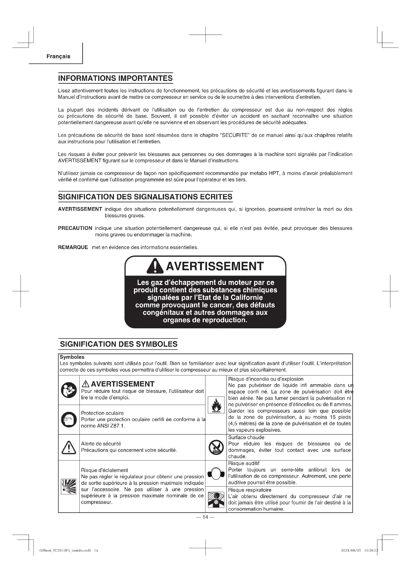 All quality compressors will eventually require servicing or replacement of parts because of wear and tear from normal use. To assure that only authorized genuine replacement parts will be used, all service and repairs must be performed by a metabo HPT AUTHORIZED SERVICE CENTER, only. NOTE: Specifi cations are subject to change without any obligation on the part of the metabo HPT. 00BookEC2610EAmetabo.indb1300BookEC2610EAmetabo.indb13 2021/08/0510:58:532021/08/0510:58:53Français — 14 — INFORMATIONS IMPORTANTES Lisez attentivement toutes les instructions de fonctionnement, les précautions de sécurité et les avertissements fi gurant dans le Manuel d’instructions avant de mettre ce compresseur en service ou de le soumettre à des interventions d’entretien. La plupart des incidents dérivant de l’utilisation ou de l’entretien du compresseur est due au non-respect des règles ou précautions de sécurité de base. Souvent, il est possible d’éviter un accident en sachant reconnaître une situation potentiellement dangereuse avant qu’elle ne survienne et en observant les procédures de sécurité adéquates. Les précautions de sécurité de base sont résumées dans le chapitre “SECURITE” de ce manuel ainsi qu’aux chapitres relatifs aux instructions pour l’utilisation et l’entretien. Les risques à éviter pour prévenir les blessures aux personnes ou des dommages à la machine sont signalés par l’indication AVERTISSEMENT fi gurant sur le compresseur et dans le Manuel d’instructions. N’utilisez jamais ce compresseur de façon non spécifi quement recommandée par metabo HPT, à moins d’avoir préalablement vérifi é et confi rmé que l’utilisation programmée est sûre pour l’opérateur et les tiers.