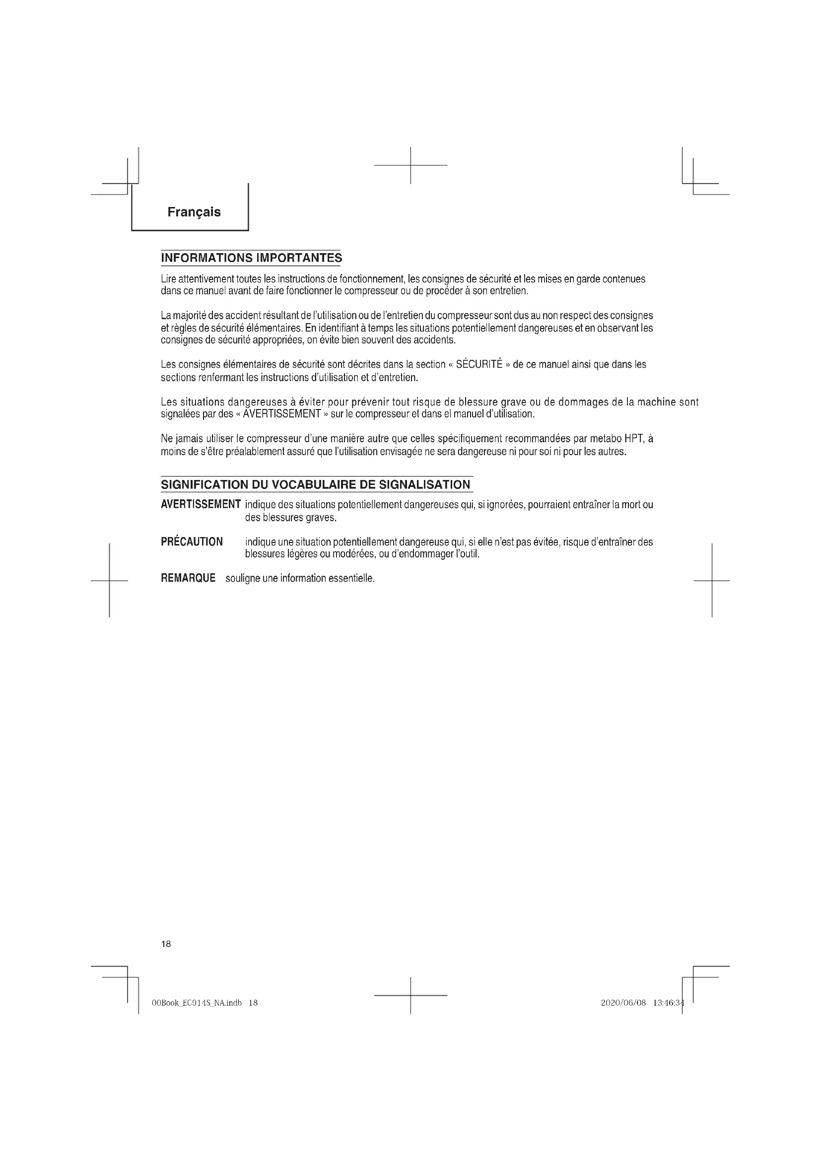 Do not disassemble check valve while air is in tank - empty the all the air out of the tank before dissasembly. There is excessive moisture in the air discharge. There is excessive water in the air tank. The humidity is high. Drain the tank to remove water. Move the compressor to an area of less humidity or use an air line fi lter to reduce moisture discharge in the tank. Air is leaking from the compressor. The hose connection is loose or improperly sealed. The air hose is broken or damaged. Ensure connections are sealed with thread sealing tape and tightened. Replace the air hose. The compressor runs continuously The tank drain valve is open. The pressure switch is defective. The usage is excessive. Ensure the tank drain valve is closed. Take the compressor to a service center. Decrease the amount of tool run-time; the compressor is not large enough to supply the air requirement of the tool. The compressor vibrates. The compressor mounting bolts are loose. Tighten mounting bolts. The air output is lower than normal. The inlet valves are broken. The connections are leaking. Take the compressor to a service center. Apply thread sealing tape to fi tting and tighten. 00BookEC914SNA.indb1700BookEC914SNA.indb17 2020/06/0813:46:342020/06/0813:46:3418 Français INFORMATIONS IMPORTANTES Lire attentivement toutes les instructions de fonctionnement, les consignes de sécurité et les mises en garde contenues dans ce manuel avant de faire fonctionner le compresseur ou de procéder à son entretien. La majorité des accident résultant de l’utilisation ou de l’entretien du compresseur sont dus au non respect des consignes et règles de sécurité élémentaires. En identifi ant à temps les situations potentiellement dangereuses et en observant les consignes de sécurité appropriées, on évite bien souvent des accidents. Les consignes élémentaires de sécurité sont décrites dans la section « SÉCURITÉ » de ce manuel ainsi que dans les sections renfermant les instructions d’utilisation et d’entretien. Les situations dangereuses à éviter pour prévenir tout risque de blessure grave ou de dommages de la machine sont signalées par des « AVERTISSEMENT » sur le compresseur et dans el manuel d’utilisation. Ne jamais utiliser le compresseur d’une manière autre que celles spécifi quement recommandées par metabo HPT, à moins de s’être préalablement assuré que l’utilisation envisagée ne sera dangereuse ni pour soi ni pour les autres.