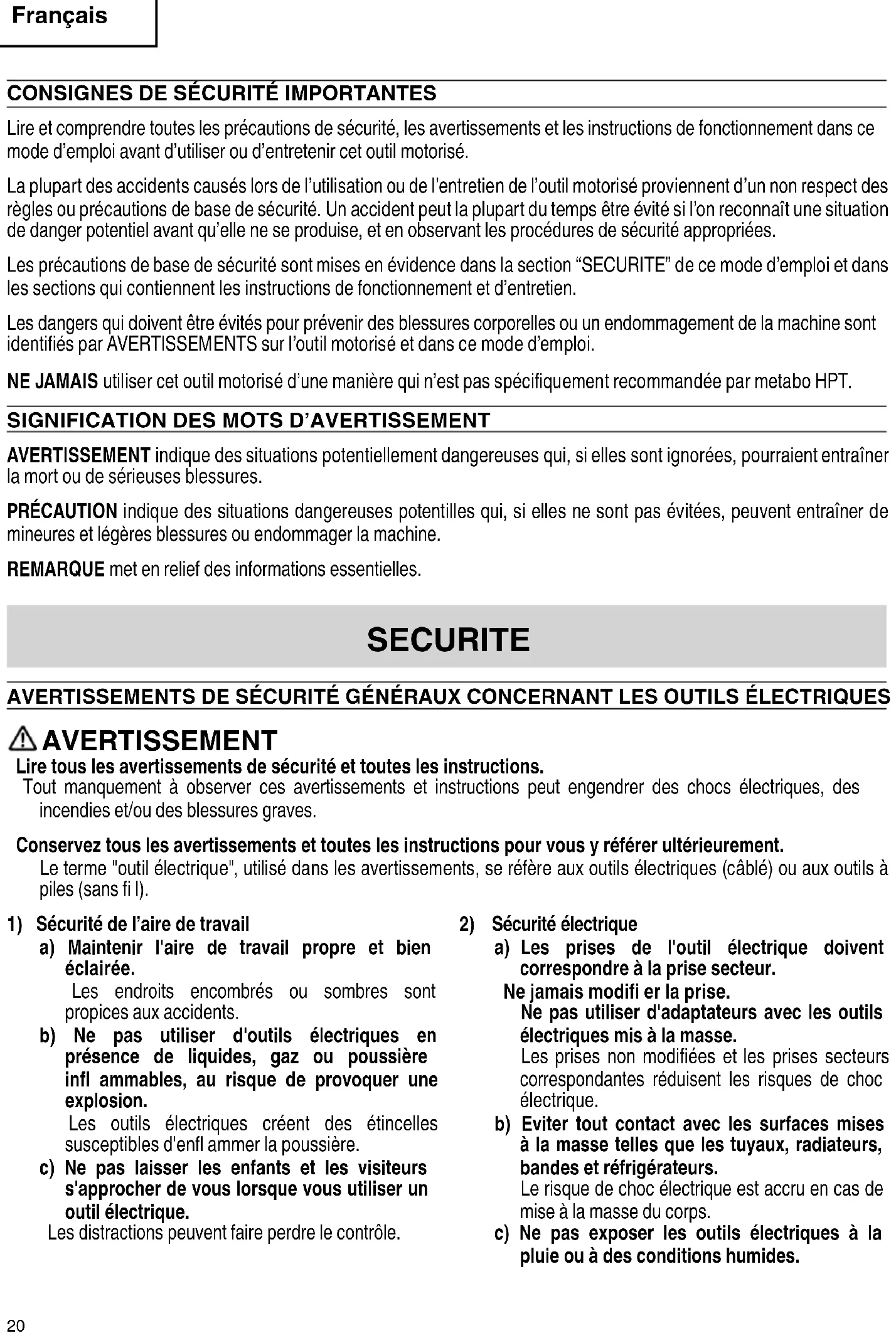English 000BookG14DSLmetabo.indb19000BookG14DSLmetabo.indb19 2018/10/179:34:102018/10/179:34:10CONSIGNES DE SÉCURITÉ IMPORTANTES Lire et comprendre toutes les précautions de sécurité, les avertissements et les instructions de fonctionnement dans ce mode d’emploi avant d’utiliser ou d’entretenir cet outil motorisé. La plupart des accidents causés lors de l’utilisation ou de l’entretien de l’outil motorisé proviennent d’un non respect des règles ou précautions de base de sécurité. Un accident peut la plupart du temps être évité si l’on reconnaît une situation de danger potentiel avant qu’elle ne se produise, et en observant les procédures de sécurité appropriées. Les précautions de base de sécurité sont mises en évidence dans la section “SECURITE” de ce mode d’emploi et dans les sections qui contiennent les instructions de fonctionnement et d’entretien. Les dangers qui doivent être évités pour prévenir des blessures corporelles ou un endommagement de la machine sont identifi és par AVERTISSEMENTS sur l’outil motorisé et dans ce mode d’emploi. NE JAMAIS utiliser cet outil motorisé d’une manière qui n’est pas spécifi quement recommandée par metabo HPT.