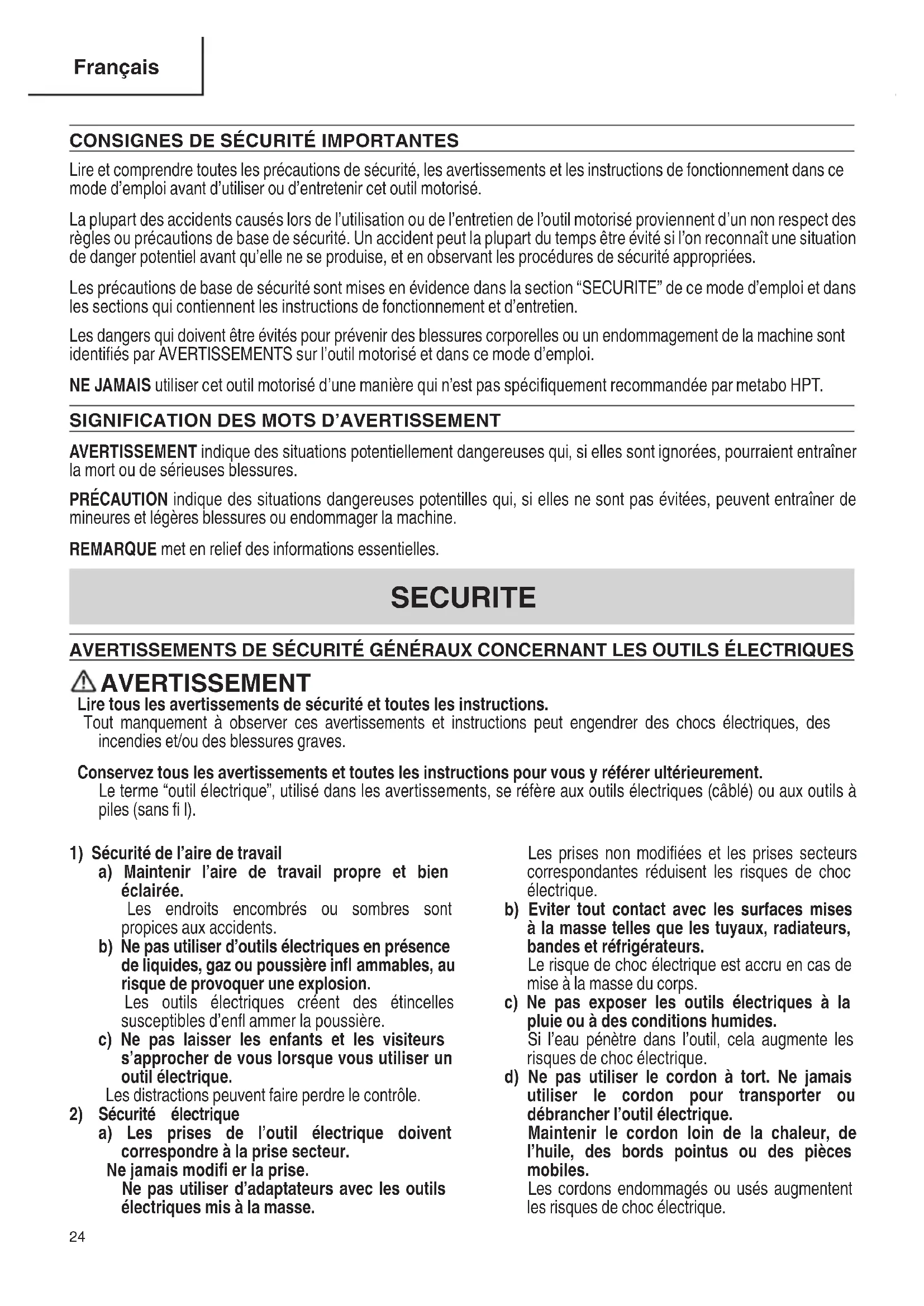 English 00BookG3612DVENA.indb2300BookG3612DVENA.indb23 2022/08/2910:54:522022/08/2910:54:52CONSIGNES DE SÉCURITÉ IMPORTANTES Lire et comprendre toutes les précautions de sécurité, les avertissements et les instructions de fonctionnement dans ce mode d’emploi avant d’utiliser ou d’entretenir cet outil motorisé. La plupart des accidents causés lors de l’utilisation ou de l’entretien de l’outil motorisé proviennent d’un non respect des règles ou précautions de base de sécurité. Un accident peut la plupart du temps être évité si l’on reconnaît une situation de danger potentiel avant qu’elle ne se produise, et en observant les procédures de sécurité appropriées. Les précautions de base de sécurité sont mises en évidence dans la section “SECURITE” de ce mode d’emploi et dans les sections qui contiennent les instructions de fonctionnement et d’entretien. Les dangers qui doivent être évités pour prévenir des blessures corporelles ou un endommagement de la machine sont identifi és par AVERTISSEMENTS sur l’outil motorisé et dans ce mode d’emploi. NE JAMAIS utiliser cet outil motorisé d’une manière qui n’est pas spécifi quement recommandée par metabo HPT.