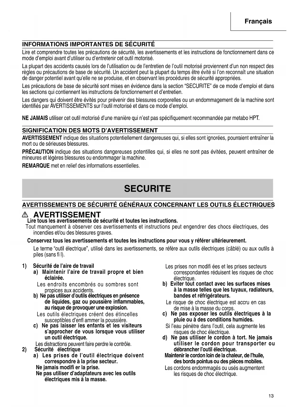 English 00BookG12SA4.indb1200BookG12SA4.indb12 2020/02/1110:54:582020/02/1110:54:58INFORMATIONS IMPORTANTES DE SÉCURITÉ Lire et comprendre toutes les précautions de sécurité, les avertissements et les instructions de fonctionnement dans ce mode d’emploi avant d’utiliser ou d’entretenir cet outil motorisé. La plupart des accidents causés lors de l’utilisation ou de l’entretien de l’outil motorisé proviennent d’un non respect des règles ou précautions de base de sécurité. Un accident peut la plupart du temps être évité si l’on reconnaît une situation de danger potentiel avant qu’elle ne se produise, et en observant les procédures de sécurité appropriées. Les précautions de base de sécurité sont mises en évidence dans la section “SECURITE” de ce mode d’emploi et dans les sections qui contiennent les instructions de fonctionnement et d’entretien. Les dangers qui doivent être évités pour prévenir des blessures corporelles ou un endommagement de la machine sont identifi és par AVERTISSEMENTS sur l’outil motorisé et dans ce mode d’emploi. NE JAMAIS utiliser cet outil motorisé d’une manière qui n’est pas spécifi quement recommandée par metabo HPT.