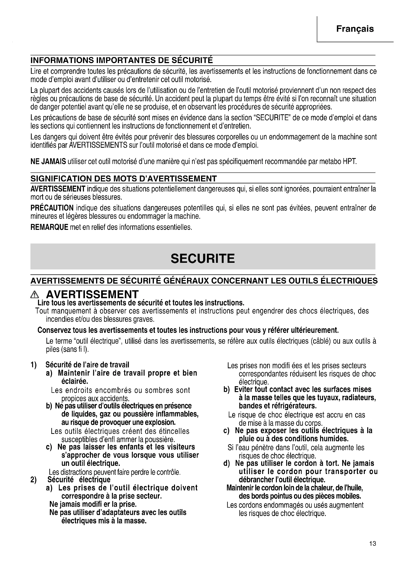 English 00BookG12SQ2.indb1200BookG12SQ2.indb12 2018/04/1611:23:562018/04/1611:23:56INFORMATIONS IMPORTANTES DE SÉCURITÉ Lire et comprendre toutes les précautions de sécurité, les avertissements et les instructions de fonctionnement dans ce mode d’emploi avant d’utiliser ou d’entretenir cet outil motorisé. La plupart des accidents causés lors de l’utilisation ou de l’entretien de l’outil motorisé proviennent d’un non respect des règles ou précautions de base de sécurité. Un accident peut la plupart du temps être évité si l’on reconnaît une situation de danger potentiel avant qu’elle ne se produise, et en observant les procédures de sécurité appropriées. Les précautions de base de sécurité sont mises en évidence dans la section “SECURITE” de ce mode d’emploi et dans les sections qui contiennent les instructions de fonctionnement et d’entretien. Les dangers qui doivent être évités pour prévenir des blessures corporelles ou un endommagement de la machine sont identifi és par AVERTISSEMENTS sur l’outil motorisé et dans ce mode d’emploi. NE JAMAIS utiliser cet outil motorisé d’une manière qui n’est pas spécifi quement recommandée par metabo HPT.